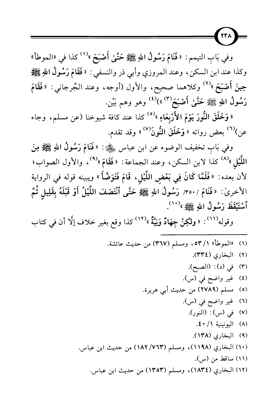 وفي بَابِ تخفيف الوضوء عن ابن عباس رضي الله عنهما: "فَنَامَ رَسُولُ اللهِ - صلى الله عليه وسلم - مِنَ اللَّيْلِ" (¬8) كذا لابن السكن، وعند الجماعة: "فَقَامَ" (¬9)، والأول الصواب؛ لأن بعده: "فَلَمَّا كَان في بَعْضِ اللَّيْلِ، قَامَ فَتَوَضَّأَ" ويبينه قوله في الرواية الأخري: "فَنَامَ رَسُولُ اللهِ - صلى الله عليه وسلم - حَتَّى انْتَصَفَ اللَّيْلُ أَوْ قَبْلَهُ بِقَلِيلٍ ثُمَّ اسْتَيْقَظَ رَسُولُ اللهِ - صلى الله عليه وسلم - " (¬10).