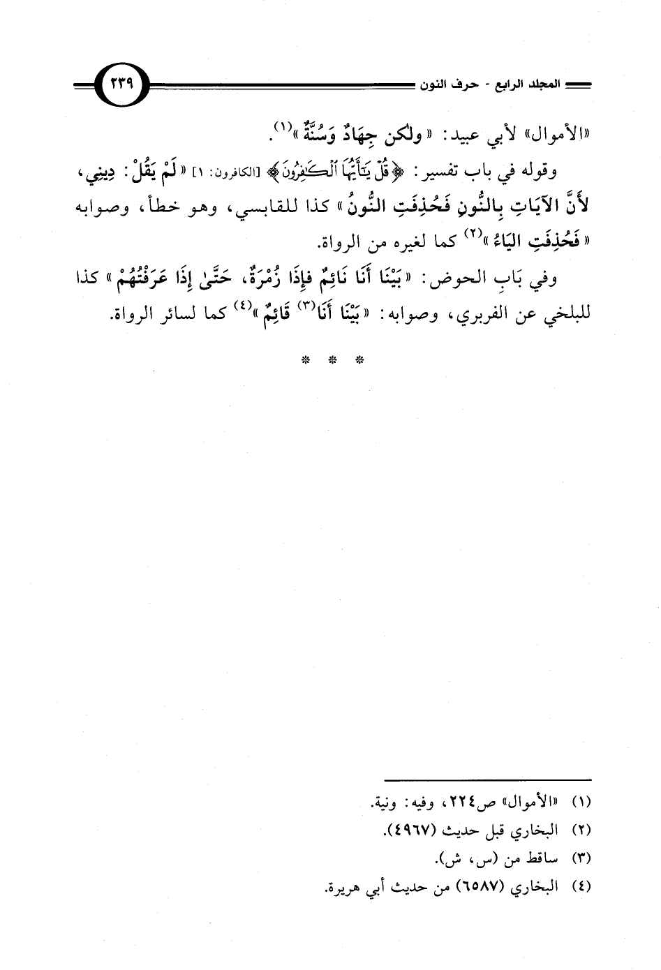 وقوله في باب تفسير: {قُلْ يَا أَيُّهَا الْكَافِرُونَ} [الكافرون: 1] "لَمْ يَقُلْ: دِينِي، لأَنَّ الآيَاتِ بِالنُّون فَحُذِفَتِ النُّونُ" كذا للقابسي، وهو خطأ، وصوابه "فَحُذِفَتِ اليَاءُ" (¬2) كما لغيره من الرواة.
