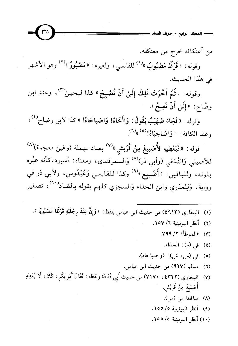 قوله: "فَيُعْطِيهِ لأُصَيبغَ مِنْ قُرَيشٍ" (¬7) بصاد مهملة (وغين معجمة) (¬8) للأصيلي وَالنَّسَفي (وأبي ذر) (8) وَالسمرقندي، ومعناه: أسيود، كأنه عيَّره بلونه، وللباقين: "أُضَيبع" (¬9) وكذا للقابسي وَعُبْدُوس، ولأبي ذر في رواية" وَللعذري وابن الحذاء وَالسجزي كلهم يقوله بالضاد (¬10)، تصغير