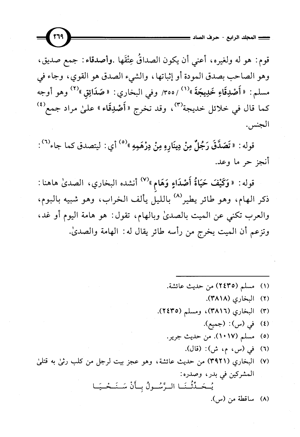 قوم: هو له ولغيره، أعني أن يكون الصداقُ عِتْقَها. وأصدقاء: جمع صديق، وهو الصاحب بصدق المودة أو إثباتها، والشيء الصدق هو القوي، وجاء في مسلم: "أَصْدِقَاءِ خَدِيجَةَ" (¬1) وفي البخاري: "صَدَائِقِ" (¬2) وهو أوجه كما قال في خلائل خديجة (¬3)، وقد تخرج "أَصْدِقَاء" على مراد جمع (¬4) الجنس.