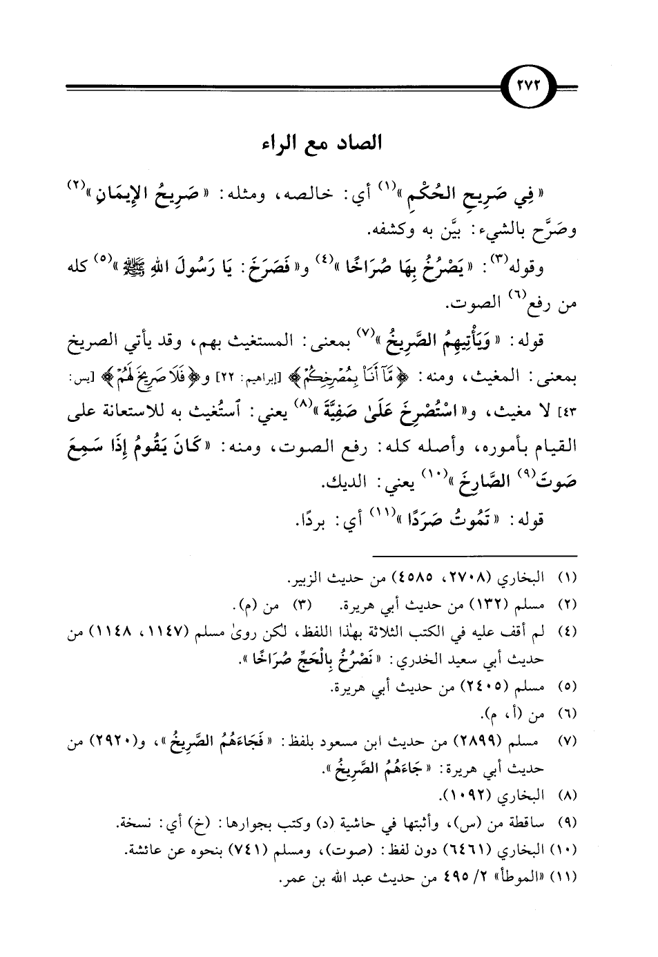 " فِي صَرِيحِ الحُكْمِ" (¬1) أي: خالصه، ومثله: "صَرِيحُ الإِيمَانِ" (¬2) وصَرَّح بالشيء: بيَّن به وكشفه.