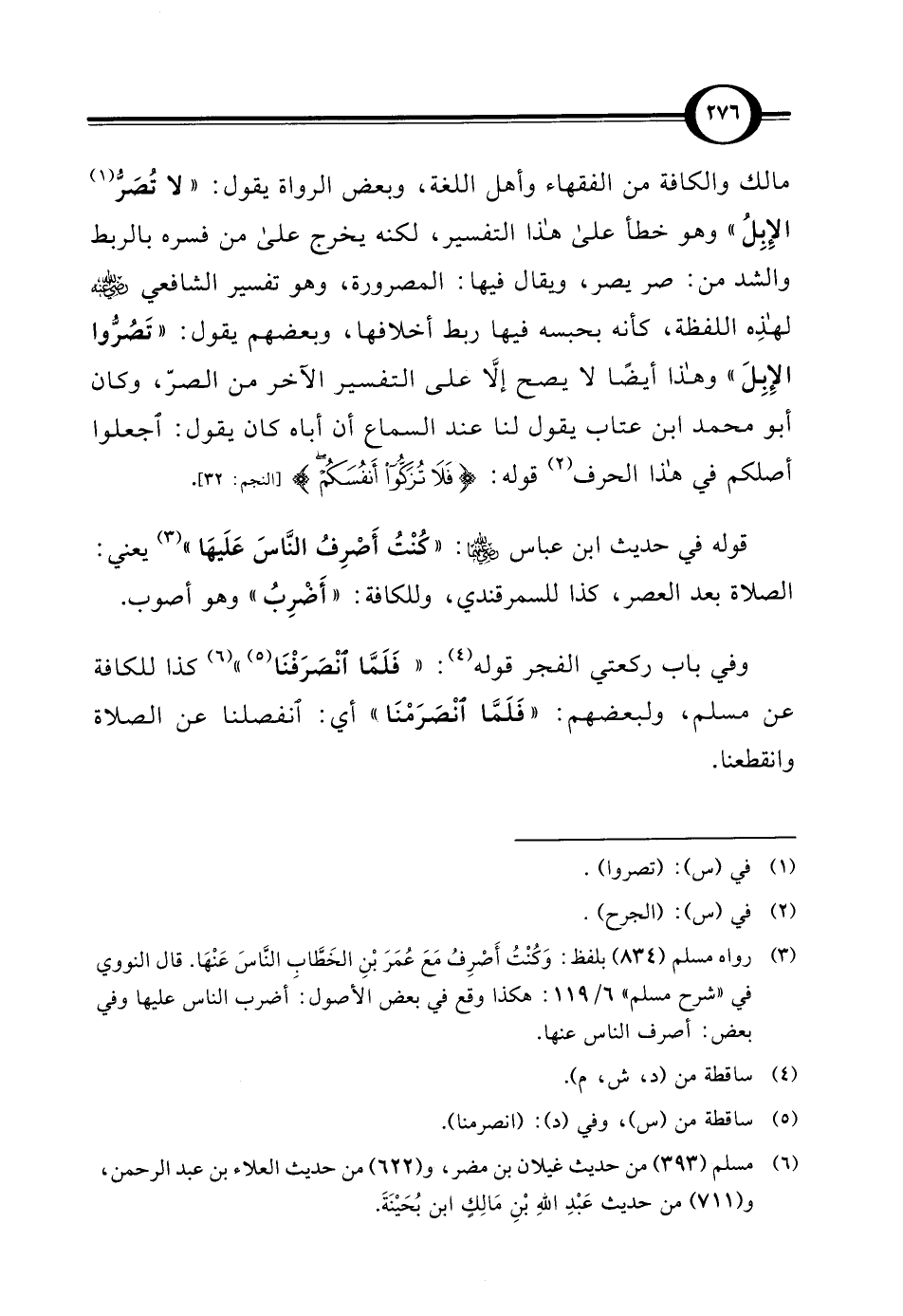 مالك والكافة من الفقهاء وأهل اللغة، وبعض الرواة يقول: "لا تُصَرُّ (¬1) الإِبِلُ" وهو خطأ على هذا التفسير، لكنه يخرج على من فسره بالربط والشد من: صر يصر، ويقال فيها: المصرورة، وهو تفسير الشافعي - رضي الله عنه - لهذِه اللفظة، كأنه بحبسه فيها ربط أخلافها، وبعضهم يقول: "تَصُرُّوا الإِبِلَ" وهذا أيضًا لا يصح إلاَّ على التفسير الآخر من الصرّ، وكان أبو محمد ابن عتاب يقول لنا عند السماع أن أباه كان يقول: اجعلوا أصلكم في هذا الحرف (¬2) قوله: {فَلَا تُزَكُّوا أَنْفُسَكُمْ} [النجم: 32].