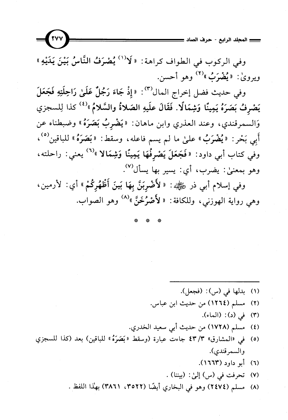 وفي حديث فضل إخراج المال (¬3): "إِذْ جَاءَ رَجُلٌ عَلَى رَاحِلَتِهِ فَجَعَلَ يَصْرِفُ بَصَرَهُ يَمِينًا وَشِمَالًا. فَقَالَ علَيهِ الصَلاةُ والسَّلامُ" (¬4) كذا لِلسجزي وَالسمرقندي، وعند العذري وابن ماهان: "يَضْرِبُ بَصَرَهُ" وضبطناه عن أَبِي بَحْر: "يُضْرَبُ" على ما لم يسم فاعله، وسقط: "بَصَرَهُ" للباقين (¬5)، وفي كتاب أبي داود: "فَجَعَلَ يَصْرِفُهَا يَمِينًا وَشِمَالا" (¬6) يعني: راحلته، وهو بمعنى: يضرب، أي: يسير بها يسأل (¬7).