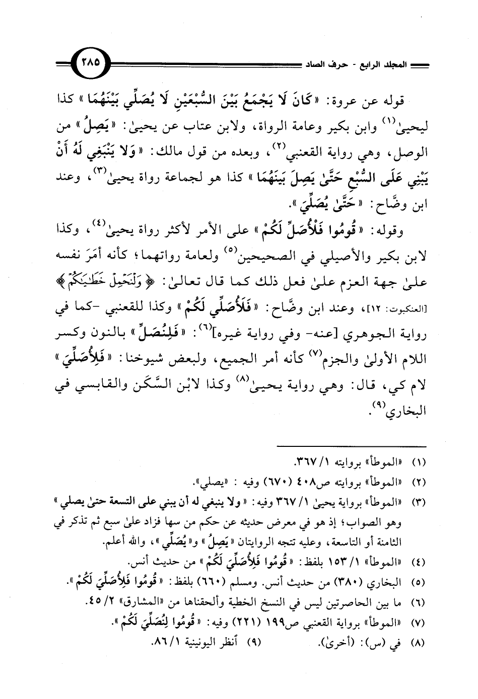(¬3) "الموطأ" برواية يحيى 1/ 367 وفيه: "ولا ينبغي له أن يبني على التسعة حتى يصلي" وهو الصواب، إذ هو في معرض حديثه عن حكم من سها فزاد على سبع ثم تذكر في الثامنة أو التاسعة، وعليه تتجه الروايتان "يَصِلُ" و"يُصَلِّي"، والله أعلم.