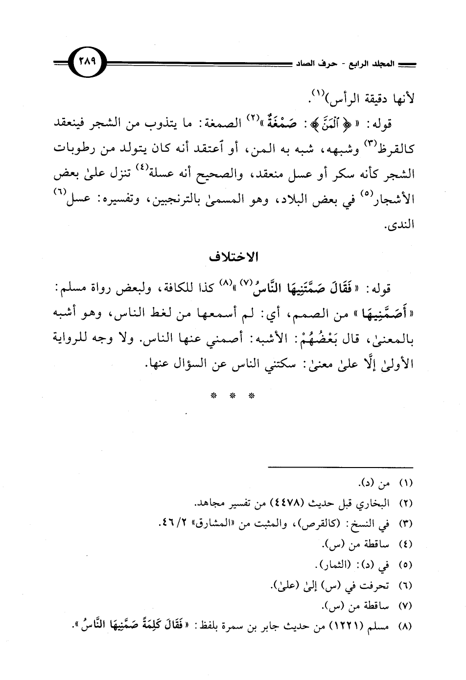 قوله: " {المَنَّ}: صَمْغَةٌ" (¬2) الصمغة: ما يتذوب من الشجر فينعقد كالقرظ (¬3) وشبهه، شبه به المن، أو اعتقد أنه كان يتولد من رطوبات الشجر كأنه سكر أو عسل منعقد، والصحيح أنه عسلة (¬4) تنزل على بعض الأشجار (¬5) في بعض البلاد، وهو المسمى بالترنجبين، وتفسيره: عسل (¬6) الندى.