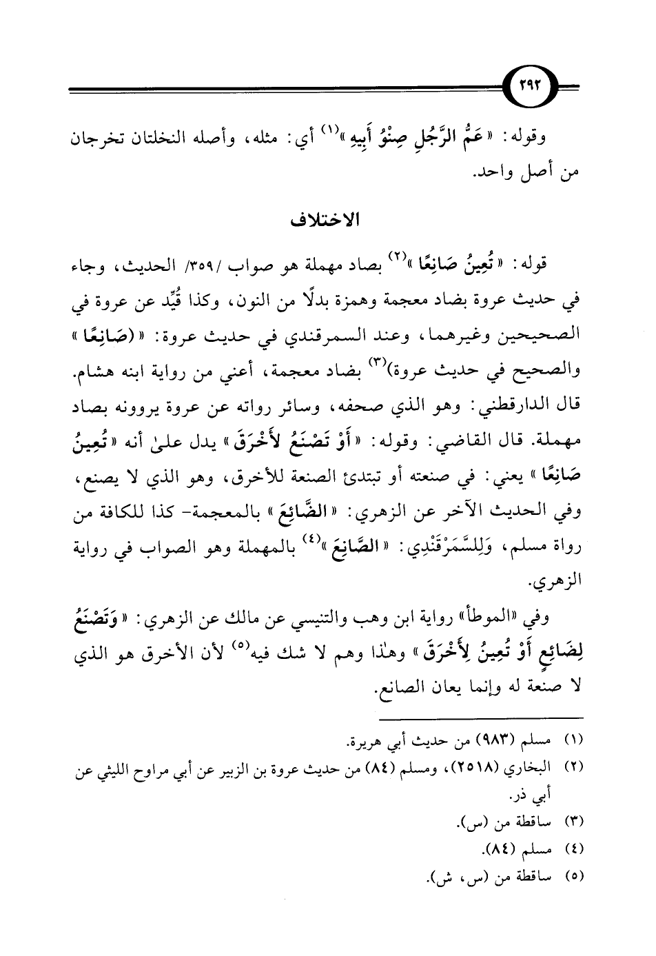 قال الدارقطني: وهو الذي صحفه، وسائر رواته عن عروة يروونه بصاد مهملة. قال القاضي: وقوله: "أَوْ تَصْنَعُ لأَخْرَقَ" يدل على أنه "تُعِينُ صَانِعًا" يعني: في صنعته أو تبتدئ الصنعة للأخرق، وهو الذي لا يصنع، وفي الحديث الآخر عن الزهري: "الضَّائِعَ" بالمعجمة - كذا للكافة من رواة مسلم، وَلِلسَّمَرْقَنْدِي: "الصَّانِعَ" (¬4) بالمهملة وهو الصواب في رواية الزهري.