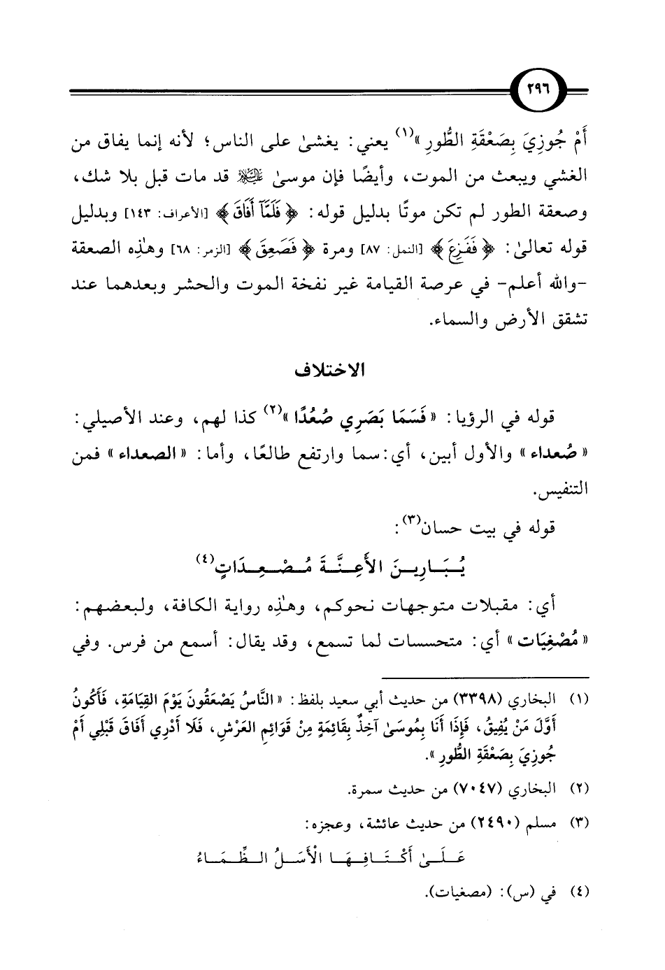 أَمْ جُوزِيَ بِصعْقَةِ الطُّورِ" (¬1) يعني: يغشى على الناس؛ لأنه إنما يفاق من الغشي ويبعث من الموت، وأيضًا فإن موسى عليه السلام قد مات قبل بلا شك، وصعقة الطور لم تكن موتًا بدليل قوله: {فَلَمَّا أَفَاقَ} [الأعراف: 143] وبدليل قوله تعالى: {فَفَزِعَ} [النمل: 87] ومرة {فَصَعِقَ} [الزمر: 68] وهذه الصعقة - والله أعلم - في عرصة القيامة غير نفخة الموت والحشر وبعدهما عند تشقق الأرض والسماء.