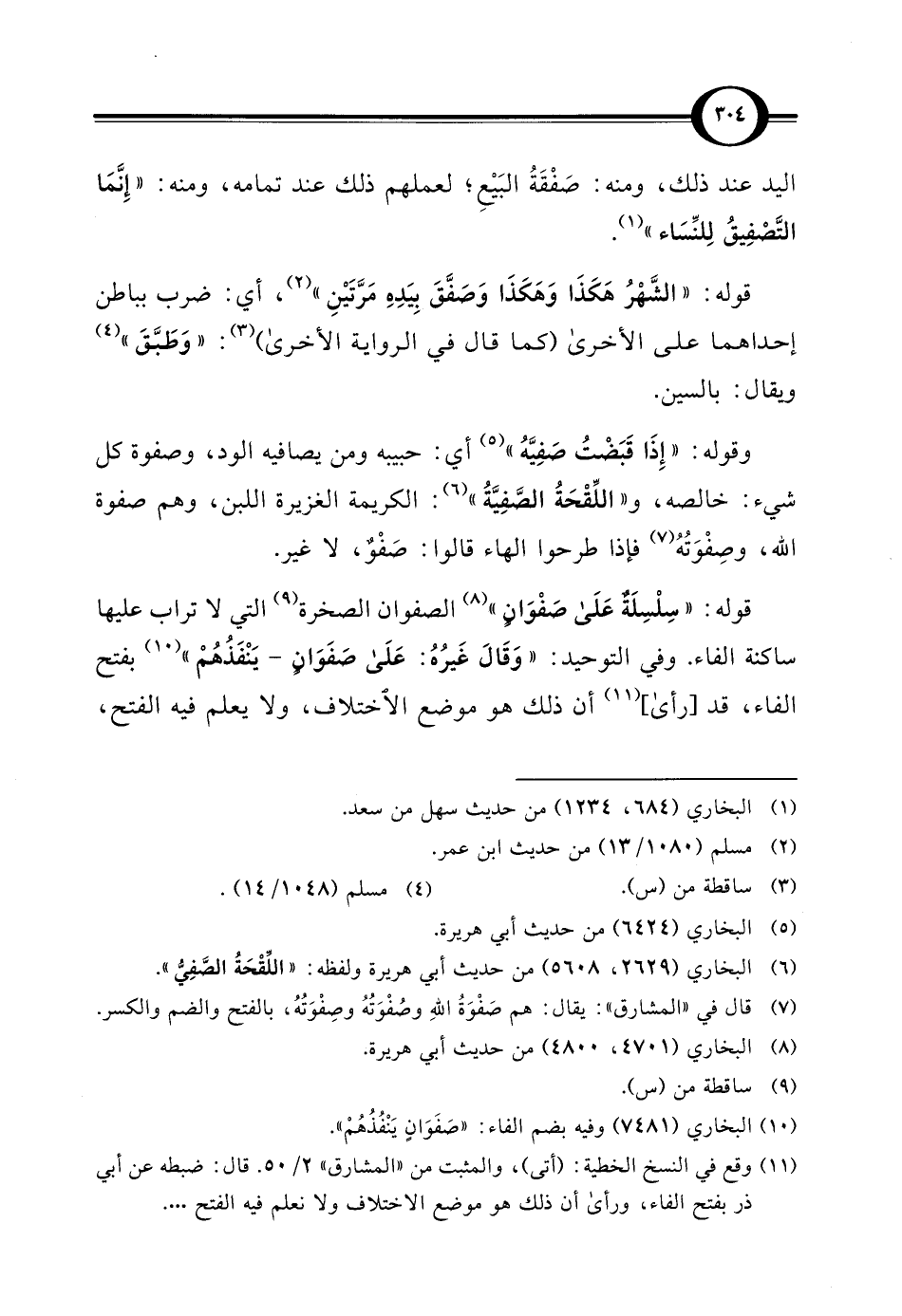 قوله: "سِلْسِلَةٌ عَلَى صَفْوَانٍ" (¬8) الصفوان الصخرة (¬9) التي لا تراب عليها ساكنة الفاء. وفي التوحيد: "وَقَالَ غَير: عَلَى صَفَوَنٍ - يَنْفَذُهُمْ" (¬10) بفتح الفاء، قد [رأى]، (¬11) أن ذلك هو موضع الاختلاف، ولا يعلم فيه الفتح،