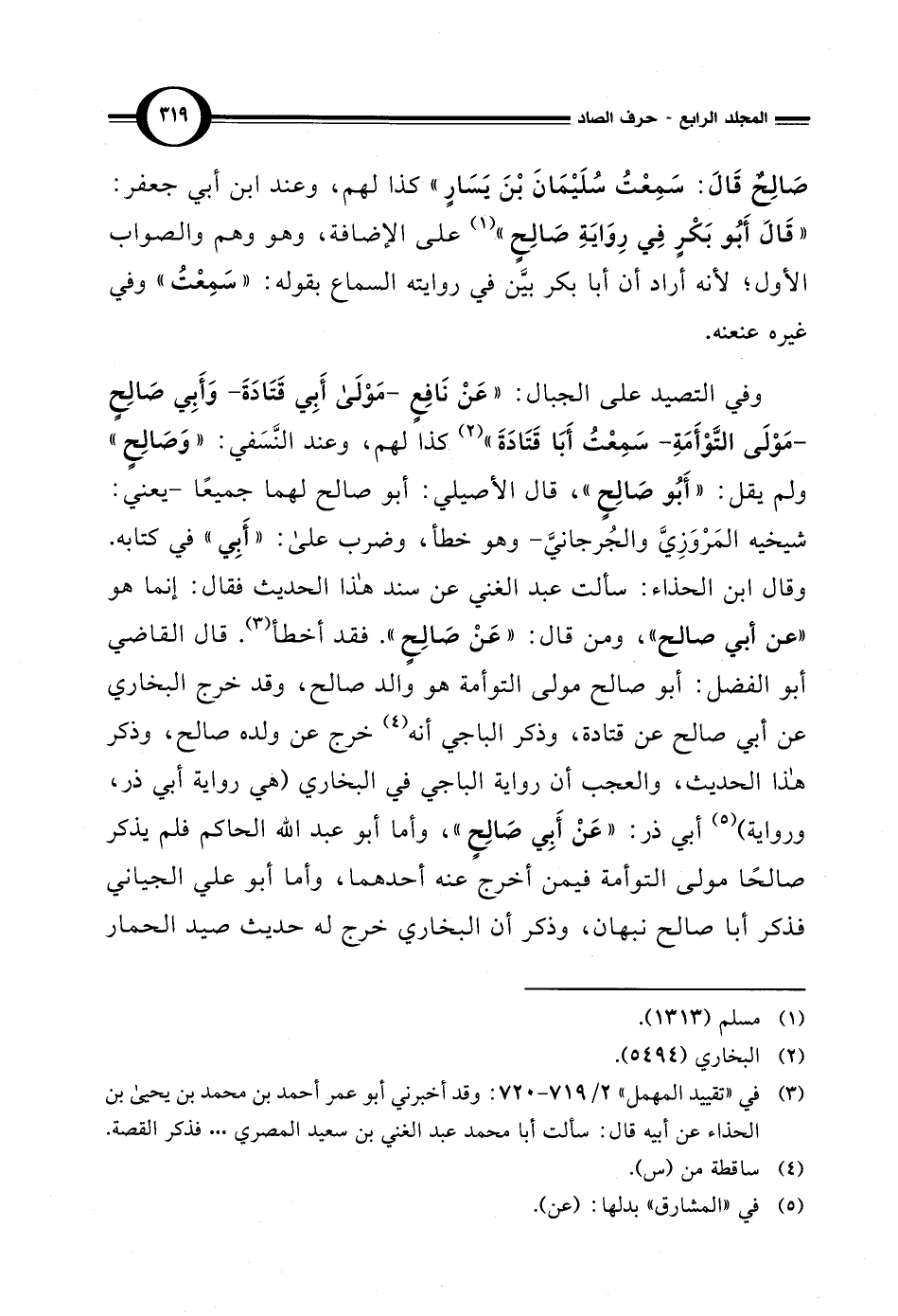 وقال ابن الحذاء: سألت عبد الغني عن سند هذا الحديث فقال: إنما هو "عن أبي صالح"، ومن قال: "عَنْ صَالِحٍ". فقد أخطأ (¬3). قال القاضي أبو الفضل: أبو صالح مولى التوأمة هو والد صالح، وقد خرج البخاري عن أبي صالح عن قتادة، وذكر الباجي أنه (¬4) خرج عن ولده صالح، وذكر هذا الحديث، والعجب أن رواية الباجي في البخاري (هي رواية أبي ذر، ورواية) (¬5) أبي ذر: "عَنْ أَبِي صَالِحٍ"، وأما أبو عبد الله الحاكم فلم يذكر صالحًا مولى التوأمة فيمن أخرج عنه أحدهما، وأما أبو علي الجياني فذكر أبا صالح نبهان، وذكر أن البخاري خرج له حديث صيد الحمار