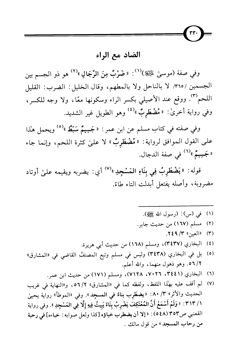 وفي صفة (موسى عليه السلام) (¬1): "ضَرْبٌ مِنَ الرِّجَالِ" (¬2) هو ذو الجسم بين الجسمين لا بالناحل ولا بالمطهم، وقال الخليل: الضرب: القليل اللحم (¬3). ووقع عند الأصيلي بكسر الراء وسكونها معًا, ولا وجه للكسر، وفي رواية أخري: "مُضْطَرِبٌ" (¬4) وهو الطويل غير الشديد.