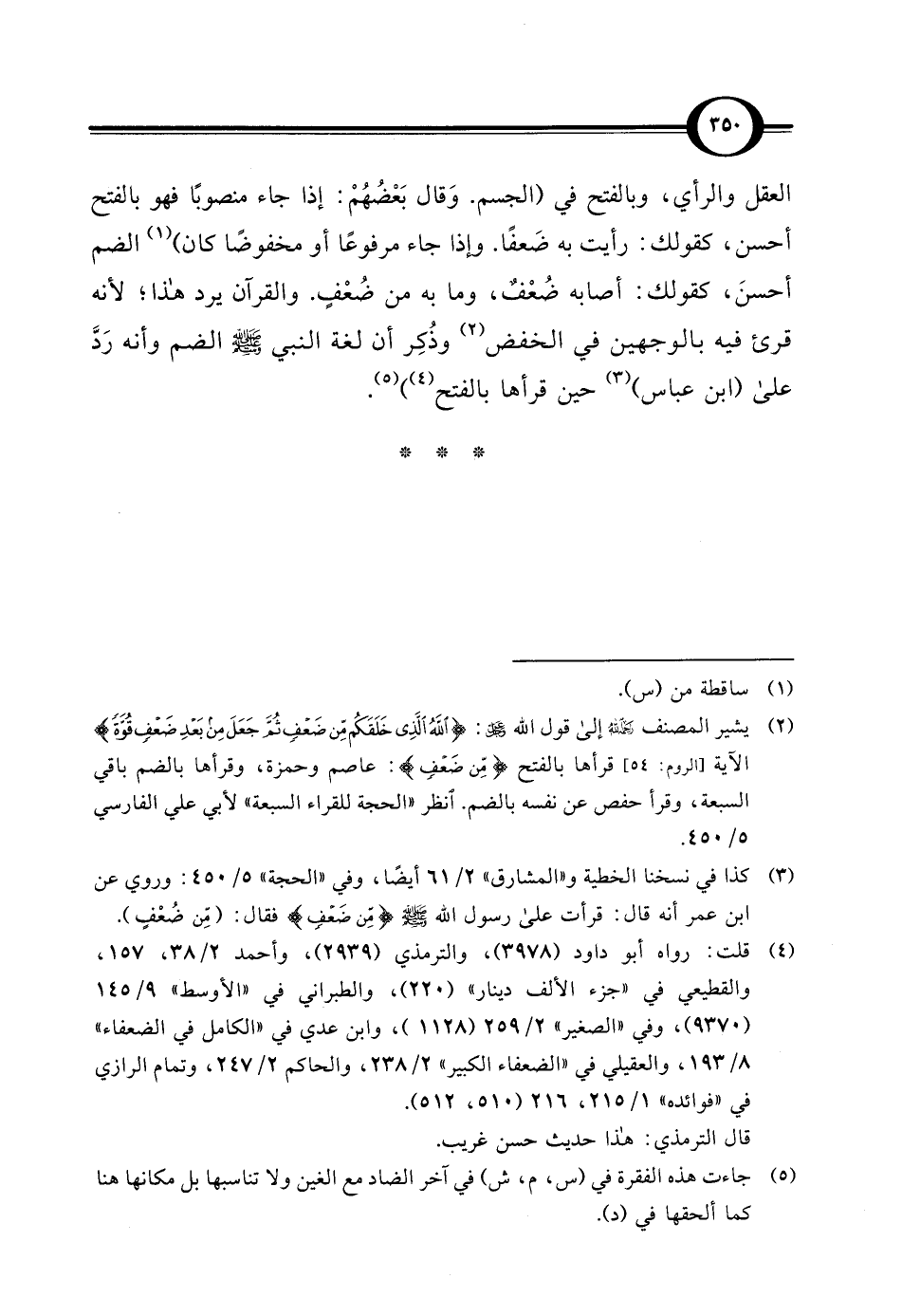 العقل والرأي، وبالفتح في (الجسم. وَقال بَعْضُهُمْ: إذا جاء منصوبًا فهو بالفتح أحسن، كقولك: رأيت به ضَعفًا. وإذا جاء مرفوعًا أو مخفوضًا كان) (¬1) الضم أحسنَ، كقولك: أصابه ضُعْفٌ، وما به من ضُعْفٍ. والقرآن يرد هذا؛ لأنه قرئ فيه بالوجهين في الخفض (¬2) وذُكِر أن لغة النبي - صلى الله عليه وسلم - الضم وأنه رَدَّ علي (ابن عباس) (¬3) حين قرأها بالفتح (¬4)) (¬5).