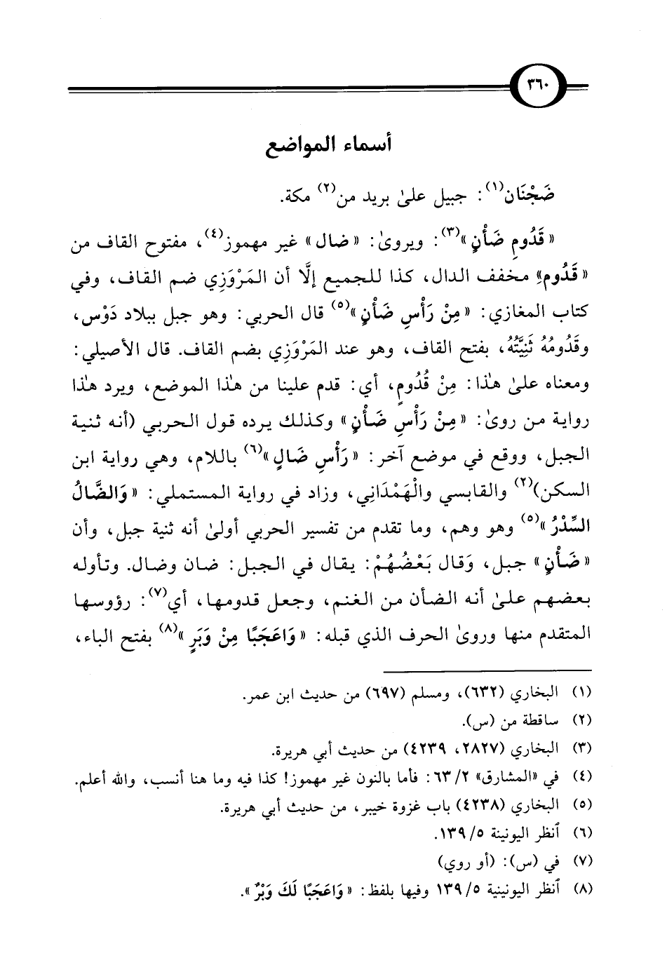 "قَدُومِ ضَأْنٍ" (¬3): ويروي: "ضال" غير مهموز (¬4)، مفتوح القاف من "قَدُومِ" مخفف الدال، كذا للجميع إلَّا أن المَرْوَزِي ضم القاف، وفي كتاب المغازي: "مِنْ رَأْسِ ضَأْنٍ" (¬5) قال الحربي: وهو جبل ببلاد دَوْس، وقَدُومُهُ ثَنِيَّتُهُ، بفتح القاف، وهو عند المَرْوَزِي بضم القاف. قال الأصيلي: ومعناه علي هذا: مِنْ قُدُومٍ، أي: قدم علينا من هذا الموضع، ويرد هذا رواية من روي: "مِنْ رَأْسِ ضَأْنٍ" وكذلك يرده قول الحربي (أنه ثنية الجبل، ووقع في موضع آخر: "رَأْسِ ضَالٍ" (¬6) باللام، وهي رواية ابن السكن) (2) والقابسي والْهَمْدَانِي، وزاد في رواية المستملي: "وَالضَّالُ السِّدْرُ" (5) وهو وهم، وما تقدم من تفسير الحربي أولى أنه ثنية جبل، وأن "ضَأْنٍ" جبل، وَقال بَعْضُهُمْ: يقال في الجبل: ضان وضال. وتأوله بعضهم علي أنه الضأن من الغنم، وجعل قدومها، أي (¬7): رؤوسها المتقدم منها وروي الحرف الذي قبله: "وَاعَجَبًا مِنْ وَبَرٍ" (¬8) بفتح الباء،