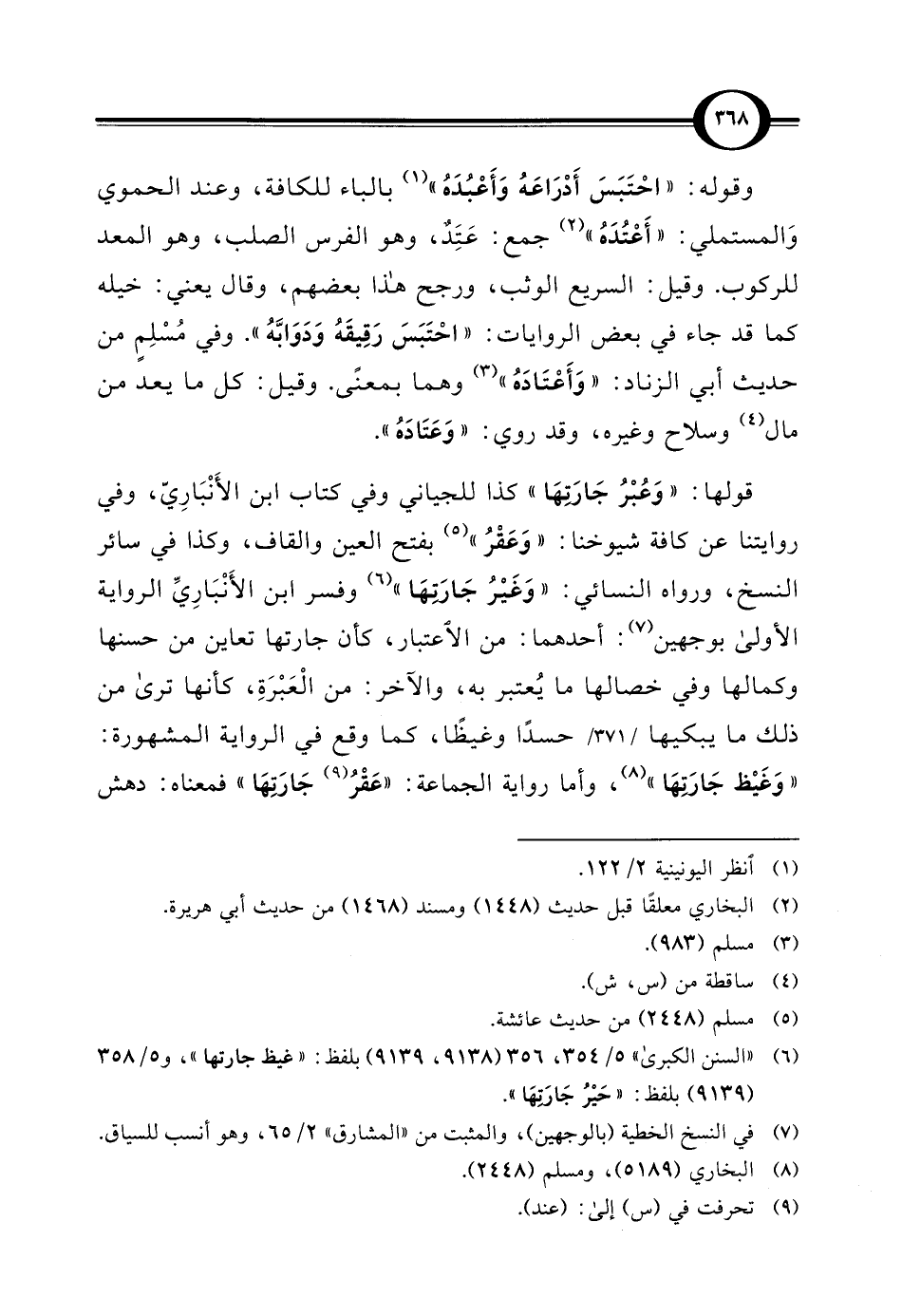 (¬6) "السنن الكبري" 5/ 354، 356 (9138، 9139) بلفظ: "غيظ جارتها"، و5/ 358 (9139) بلفظ: "حَيْرُ جَارَتهَا".