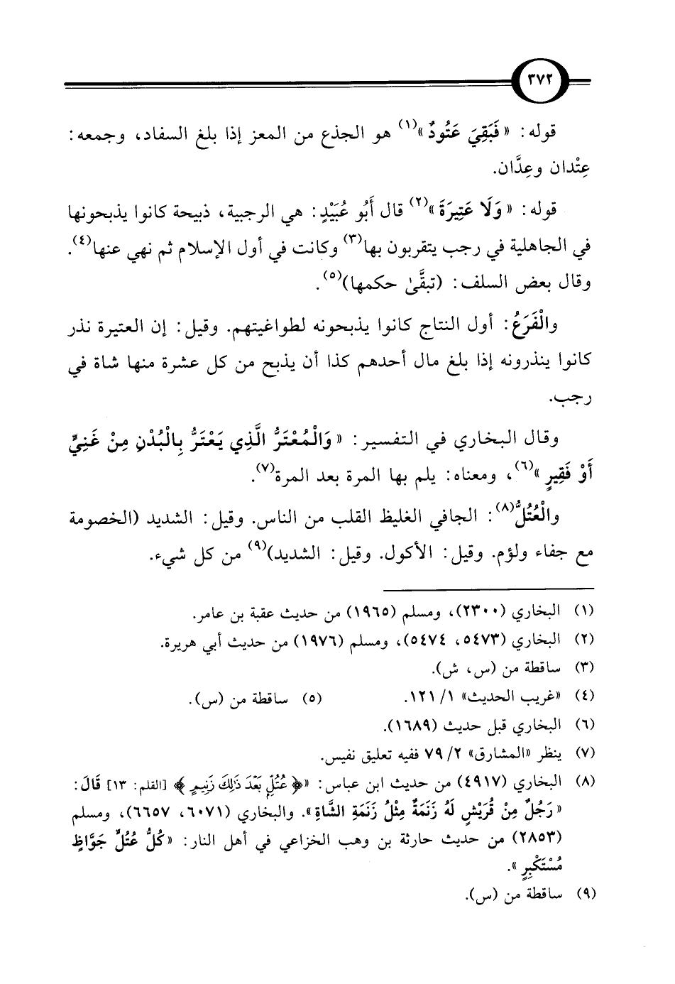 (¬8) البخاري (4917) من حديث ابن عباس: " {عُتُلٍّ بَعْدَ ذَلِكَ زَنِيمٍ} [القلم: 13] قَالَ: "رَجُل مِنْ قُرَيْشٍ لَهُ زَنَمَةٌ مِثْلُ زَنَمَةِ الشَّاةِ". والبخاري (6071، 6657)، ومسلم (2853) من حديث حارثة بن وهب الخزاعي في أهل النار: "كُلُّ عُتُلٍّ جَوَّاظٍ مُسْتَكْبِرٍ".
