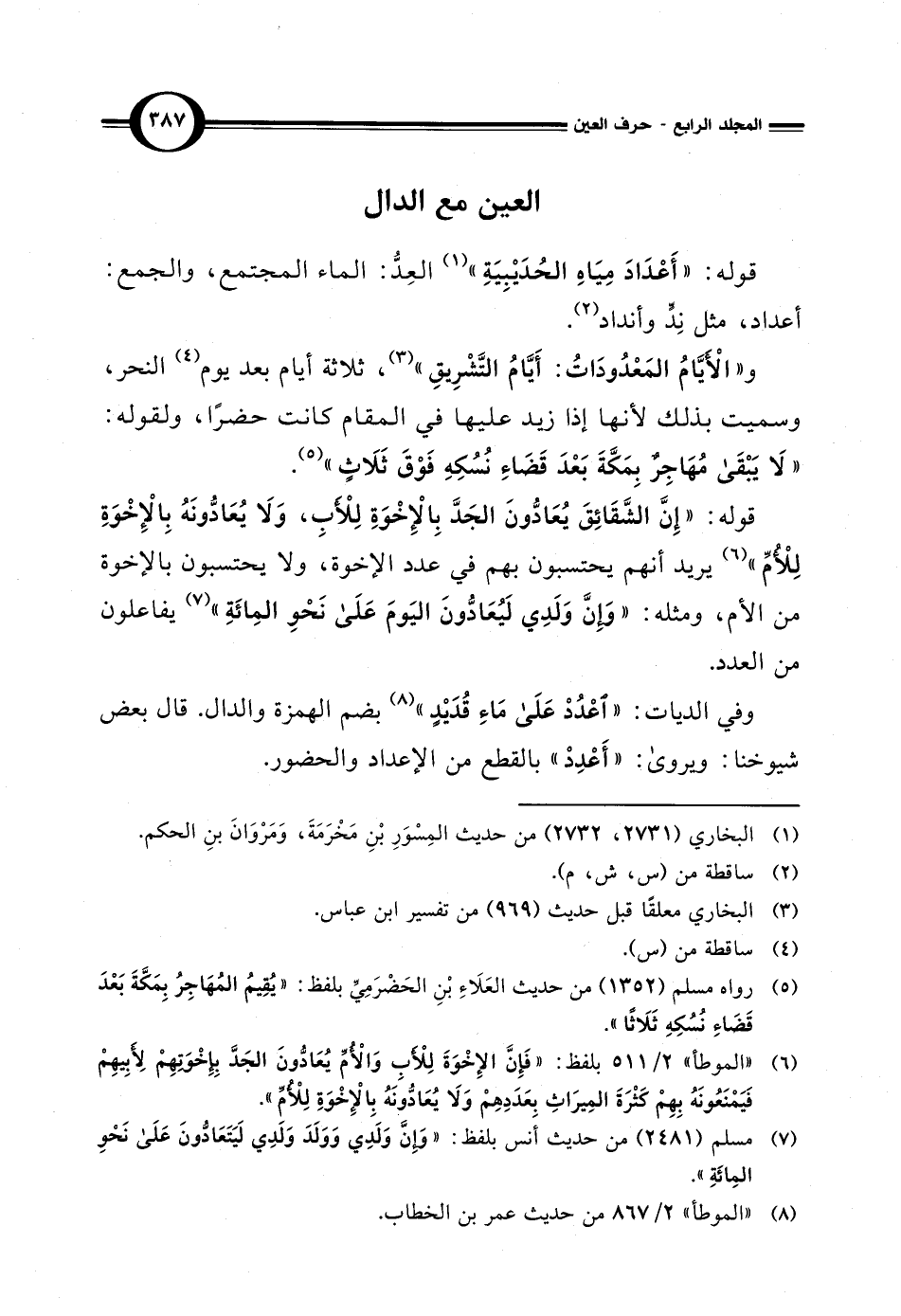 قوله: "إِنَّ الشَّقَائِقَ يُعَادُّونَ الجَدَّ بِالْإِخْوَةِ لِلأبِ، وَلَا يُعَادُّونَهُ بِالْإِخْوَةِ لِلْأمّ" (¬6) يريد أنهم يحتسبون بهم في عدد الإخوة، ولا يحتسبون بالإخوة من الأم، ومثله: "وإنَّ وَلَدِي لَيُعَادُّونَ اليَومَ عَلَى نَحْوِ المِائَةِ" (¬7) يفاعلون من العدد.