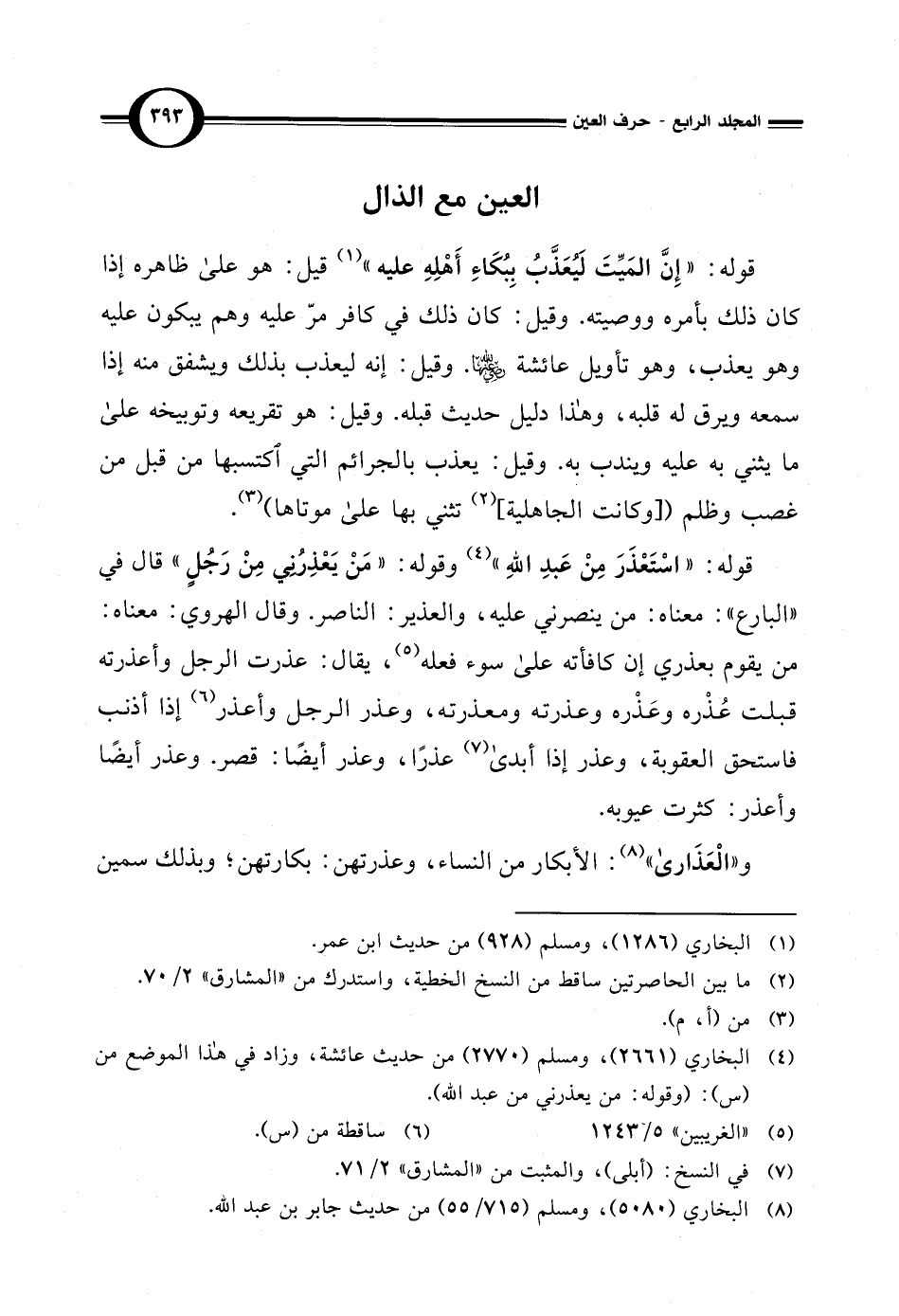 قوله: "اسْتَعْذَرَ مِنْ عَبدِ اللهِ" (¬4) وقوله: "مَنْ يَعْذِرُني مِنْ رَجُلٍ" قال في "البارع": معناه: من ينصرني عليه، والعذير: الناصر. وقال الهروي: معناه: من يقوم بعذري إن كافأته على سوء فعله (¬5)، يقال: عذرت الرجل وأعذرته قبلت عُذْره وعَذْره وعذرته ومعذرته، وعذر الرجل وأعذر (¬6) إذا أذنب فاستحق العقوبة، وعذر إذا أبدى (¬7) عذرًا، وعذر أيضًا: قصر. وعذر أيضًا وأعذر: كثرت عيوبه.