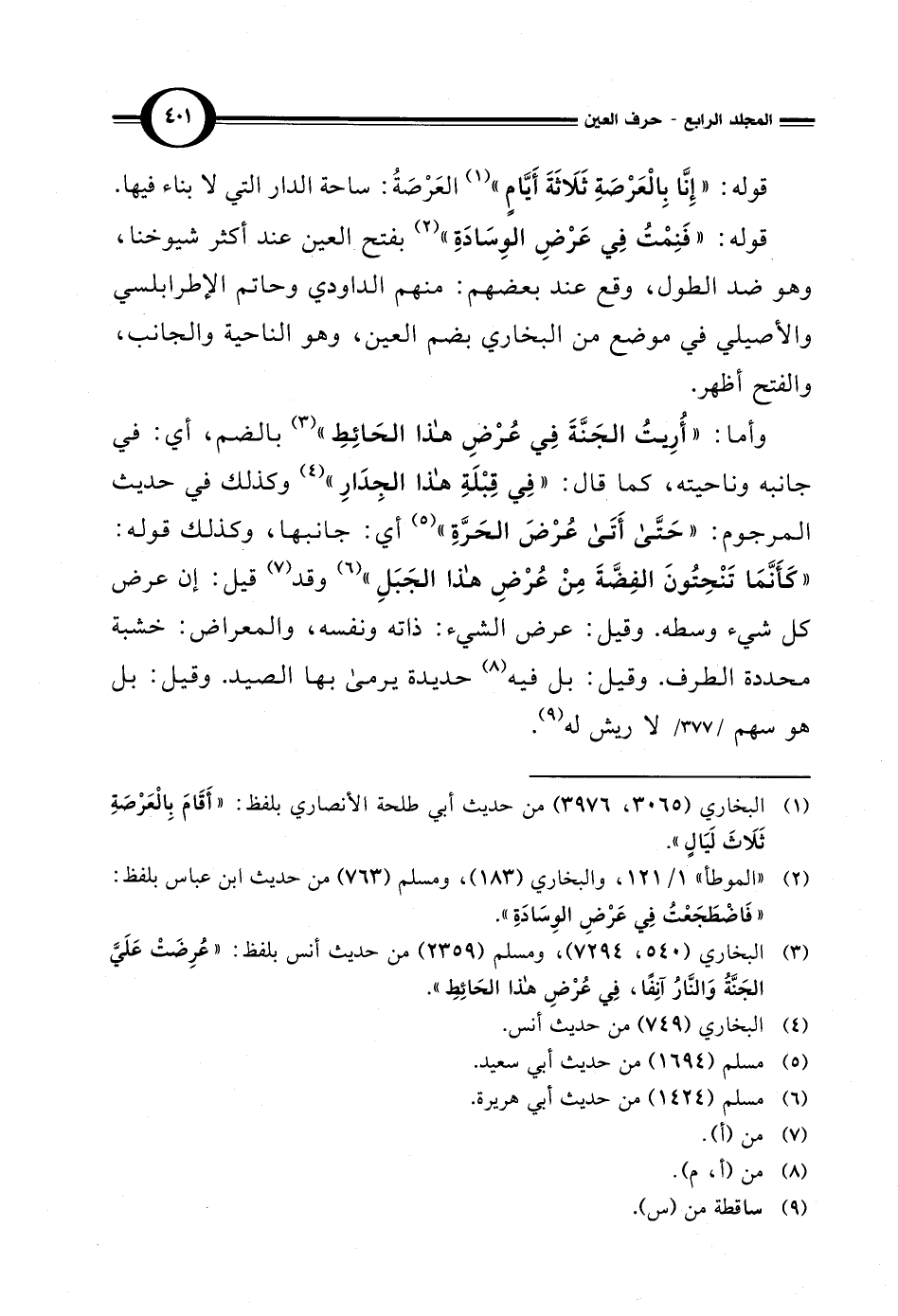 وأما: "أُرِيتُ الجَنَّةَ في عُرْضِ هذا الحَائِطِ" (¬3) بالضم، أي: في جانبه وناحيته، كما قال: "في قِبْلَةِ هذا الجِدَار" (¬4) وكذلك في حديث المرجوم: "حَتَّى أَتَى عُرْضَ الحَرَّةِ" (¬5) أي: جانبها، وكذلك قوله: "كَأَنَّمَا تَنْحِتُونَ الفِضَّةَ مِنْ عُرْضِ هذا الجَبَلِ" (¬6) وقد (¬7) قيل: إن عرض كل شيء وسطه. وقيل: عرض الشيء: ذاته ونفسه، والمعراض: خشبة محددة الطرف. وقيل: بل فيه (¬8) حديدة يرمى بها الصيد. وقيل: بل هو سهم لاريش له (¬9).