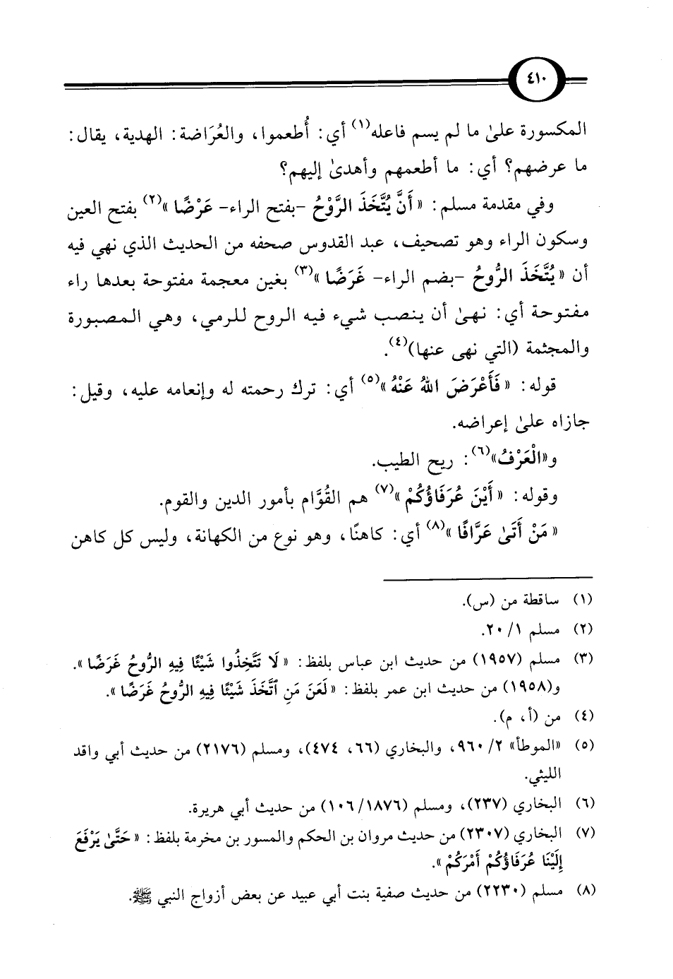 المكسورة على ما لم يسم فاعله (¬1) أي: أُطعموا، والعُرَاضة: الهدية، يقال: ما عرضهم؟ أي: ما أطعمهم وأهدى إليهم؟ وفي مقدمة مسلم: " أَنَّ يُتَّخَذَ الرَّوْحُ - بفتح الراء - عَرْضًا " (¬2) بفتح العين وسكون الراء وهو تصحيف، عبد القدوس صحفه من الحديث الذي نهي فيه أن "يُتَّخَذَ الرُّوحُ - بضم الراء - غَرَضًا" (¬3) بغين معجمة مفتوحة بعدها راء مفتوحة أي: نهى أن ينصب شيء فيه الروح للرمي، وفي المصبورة والمجثمة (التي نهى عنها) (¬4).