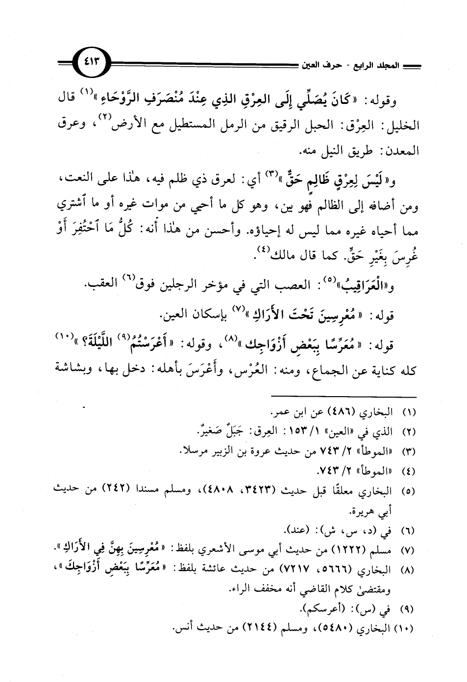وقوله: "كَانَ يُصَلِّي إِلَى العِرْقِ الذِي عِنْدَ مُنْصَرَفِ الرَّوْحَاءِ" (¬1) قال الخليل: العِرْق: الحبل الرقيق من الرمل المستطيل مع الأرض (¬2)، وعرق المعدن: طريق النيل منه.