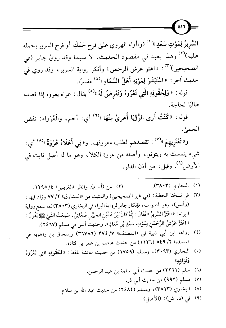 السَّرِيرُ لِمَوْتِ سَعْدٍ" (¬1) (وتأوله الهروي على فرح حَمَلَتِه أو فرح السرير بحمله عليه) (¬2) وهذا بعيد في مقصود الحديث، لا سيما وقد روى جابر (في الصحيحين) (¬3): "اهتز عرش الرحمن" وأنكر رواية السرير، وقد روي في حديث آخر: "اسْتَبْشَرَ لِمَوْتِهِ أَهْلُ السَّمَاءِ" (¬4) مفسرًا.