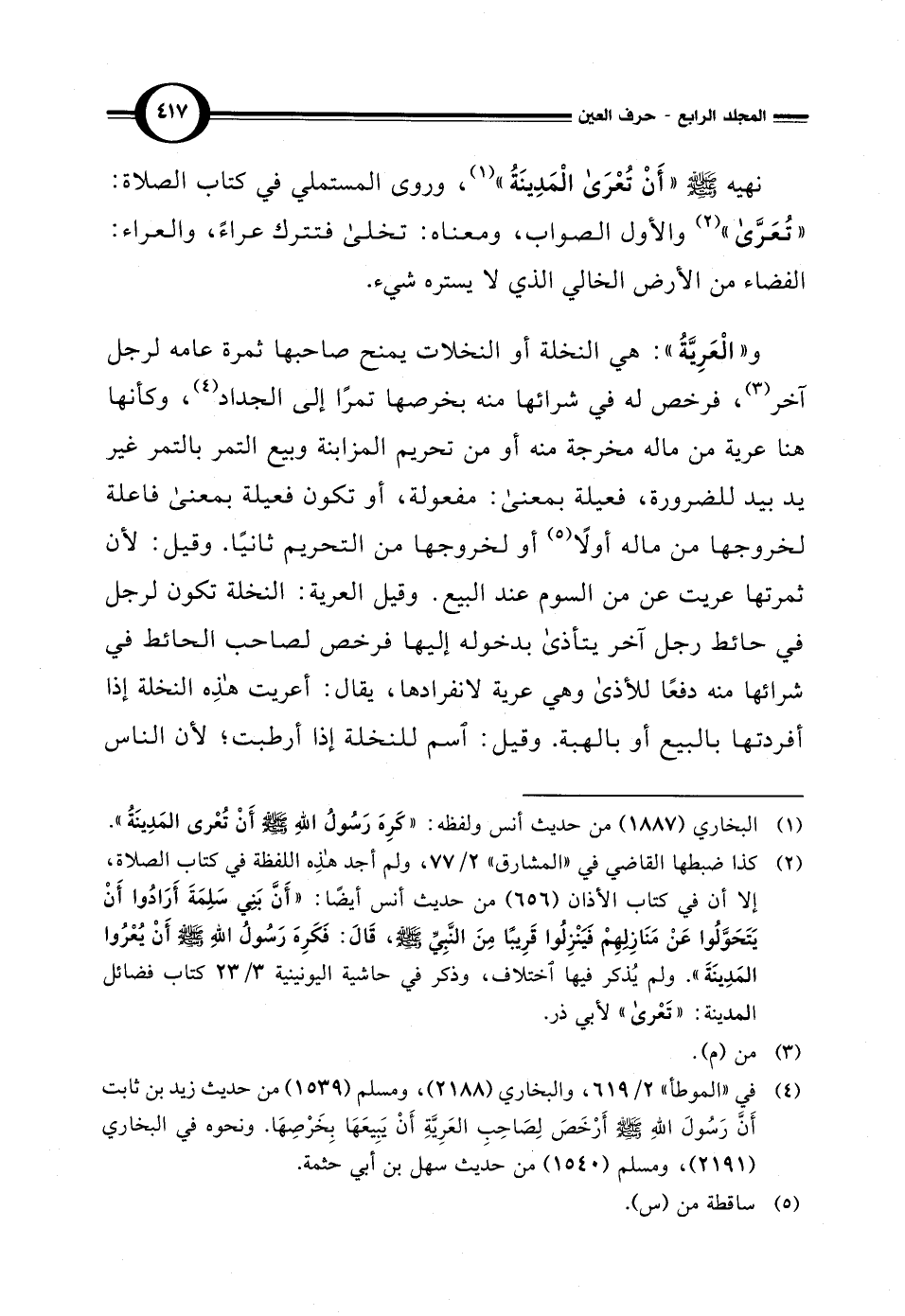 و"الْعَرِيَّةُ": هي النخلة أو النخلات يمنح صاحبها ثمرة عامه لرجل آخر (¬3)، فرخص له في شرائها منه بخرصها تمرًا إلى الجداد (¬4)، وكأنها هنا عرية من ماله مخرجة منه أو من تحريم المزابنة وبيع التمر بالتمر غير يد بيد للضرورة، فعيلة بمعنى: مفعولة، أو تكون فعيلة بمعنى فاعلة لخروجها من ماله أولاً (¬5) أو لخروجها من التحريم ثانيًا. وقيل: لأن ثمرتها عريت عن من السوم عند البيع. وقيل العرية: النخلة تكون لرجل في حائط رجل آخر يتأذى بدخوله إليها فرخص لصاحب الحائط في شرائها منه دفعًا للأذى وهي عرية لانفرادها، يقال: أعريت هذِه النخلة إذا أفردتها بالبيع أو بالهبة. وقيل: اسم للنخلة إذا أرطبت؛ لأن الناس