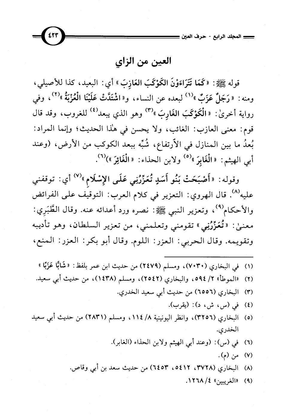 قوله - صلى الله عليه وسلم -: "كَمَا تَتَرَاءَوْنَ الكَوْكَبَ العَازِبَ" أي: البعيد، كذا للأصيلي، ومنه: "رَجَلٌ عَزَبٌ" (¬1) لبعده عن النساء، و"اشْتَدَّتْ عَلَيْنَا الْعُزْبَةُ" (¬2)، وفي رواية أخرى: "الْكَوْكَبَ الغَارِبَ" (¬3) وهو الذي يبعد (¬4) للغروب، وقد قال قوم: معنى العازب: الغائب، ولا يحسن في هذا الحديث؛ وإنما المراد: بُعدُ ما بين المنازل في الارتفاع، شُبِّه ببعد الكوكب من الأرض، (وعند أبي الهيثم: "الْغَابِرَ" (¬5) ولابن الحذاء: "الْغَائِرَ") (¬6).