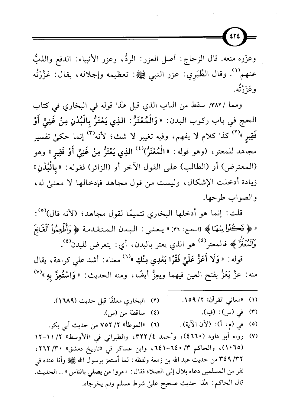 ومما سقط من الباب الذي قبل هذا قوله في البخاري في كتاب الحج في باب ركوب البدن:"وَالْمُعْتَرُّ: الذِي يَعْتَرُّ بِالْبُدن مِنْ غَنِىٍّ أَوْ فَقِيرٍ" (¬2) كذا كلام لا يفهم، وفيه تغيير لا شك؛ لأنه (¬3) إنما حكى تفسير مجاهد للمعتر، (وهو قوله: "الْمُعْتَرُّ) (¬4) الذِي يَعْتَرُّ مِنْ غَنِيٍّ أَوْ فَقِيرٍ" وهو (المعترض) أو (الطالب) على القول الآخر أو (الزائر) فقوله: "بِالْبُدْنِ" زيادة أدخلت الإشكال، وليست من قول مجاهد فإدخالها لا معنى له، والصواب طرحها.