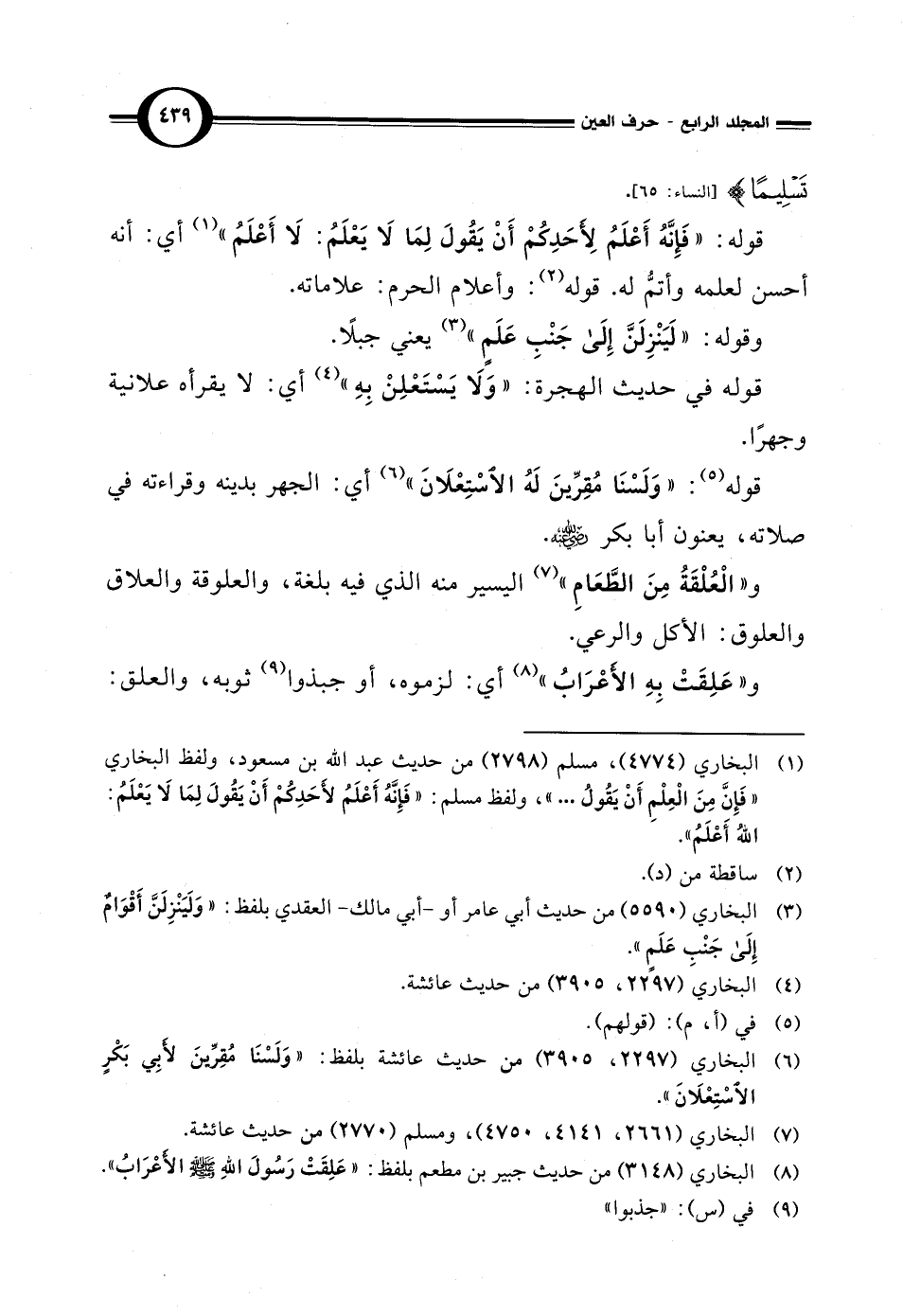 قوله: "فإِنَّهُ أَعْلَمُ لِأَحَدِكُمْ أَنْ يَقُولَ لِمَا لَا يَعْلَمُ: لَا أَعْلَمُ" (¬1) أي: أنه أحسن لعلمه وأتمُّ له. قوله (¬2): وأعلام الحرم: علاماته.