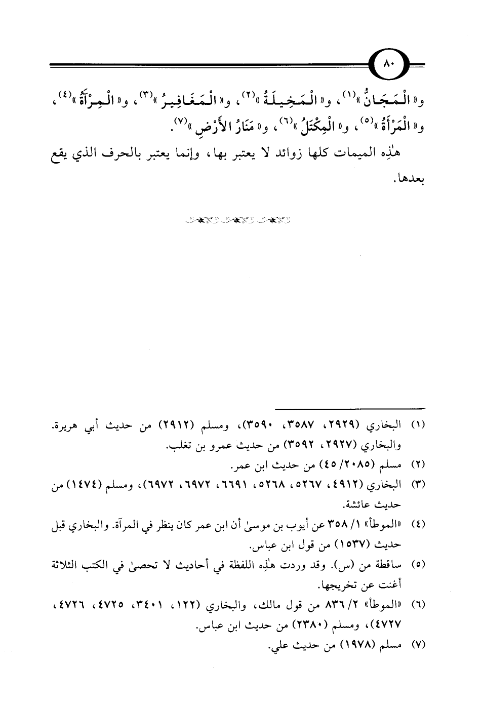 و"الْمَجَانُّ" (¬1)، و"الْمَخِيلَةُ" (¬2)، و"الْمَغَافِيرُ" (¬3)، و"الْمِرْآةُ" (¬4)، و"الْمَرْأَةُ" (¬5)، و"الْمِكْتَلُ" (¬6)، و"مَنَارُ الأَرْضِ" (¬7).