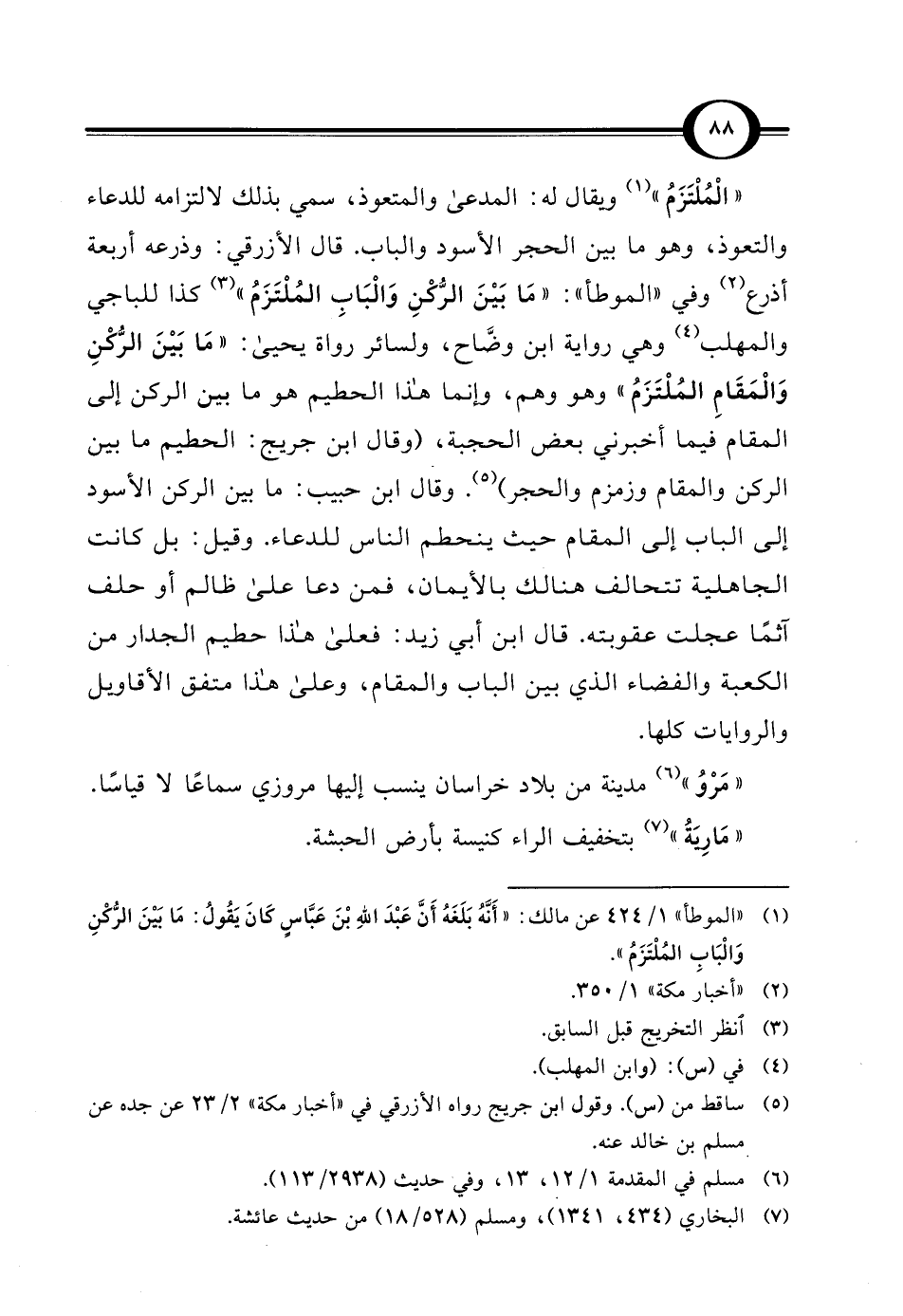 (¬1) "الموطأ" 1/ 424 عن مالك: "أَنَّهُ بَلَغَهُ أَنَّ عَبْدَ اللهِ بْنَ عَبَّاسٍ كانَ يَقُولُ: مَا بَيْنَ الرُّكْنِ وَالْبَابِ المُلْتَزَمُ".