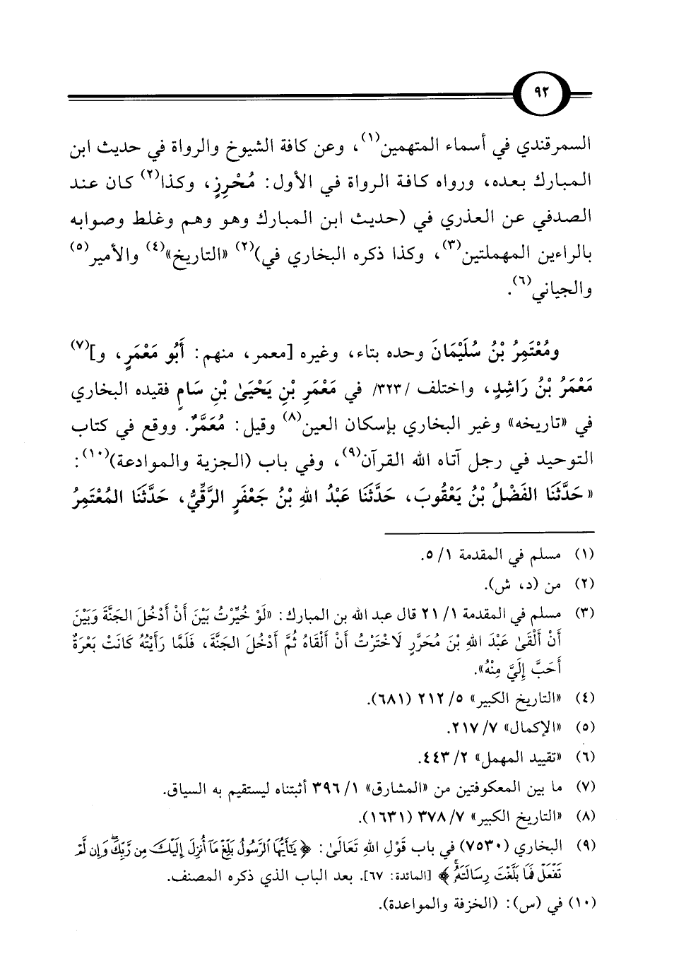 (¬3) مسلم في المقدمة 1/ 21 قال عبد الله بن المبارك: "لَوْ خُيِّرْتُ بَيْنَ أَنْ أَدْخُلَ الجَنَّةَ وَبَيْنَ أَنْ أَلْقَى عَبْدَ اللهِ بْنَ مُحَررٍ لَاخْتَرْتُ أَنْ أَلْقَاهُ ثُمَّ أَدْخُلَ الجَنَّةَ، فَلَمَّا رَأَيْتُهُ كَانَتْ بَعْرَةٌ أَحَبَّ إِلَيَّ مِنْهُ".