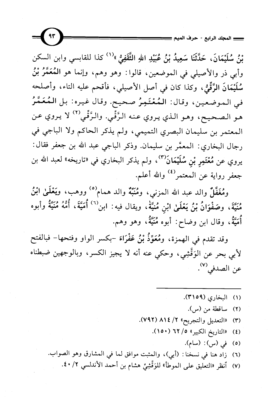 بْنُ سُلَيْمَانَ، حَدَّثنَا سَعِيدُ بْنُ عُبَيْدِ اللهِ الثَّقَفِيُّ" (¬1) كذا للقابسي وابن السكن وأبي ذر والأصيلي في الموضعين، قالوا: وهو وهم، وإنما هو المُعَمَّرُ بْنُ سُلَيْمَانَ الرَّقِّيُّ، وكذا كان في أصل الأصيلي، فأقحم عليه التاء، وأصلحه في الموضعين، وقال: المُعْتَمِرُ صحيح. وقال غيره: بل المُعَمَّرُ هو الصحيح، وهو الذي يروي عنه الرَّقِّي. والرَّقِّي (¬2) لا يروي عن المعتمر بن سليمان البصري التميمي، ولم يذكر الحاكم ولا الباجي في رجال البخاري: المعمَّر بن سليمان. وذكر الباجي عبد الله بن جعفر فقال: يروي عن مُعْتَمِرِ بْنِ سُلَيْمَانَ (¬3)، ولم يذكر البخاري في "تاريخه" لعبد الله بن جعفر رواية عن المعتمر (¬4) والله أعلم.
