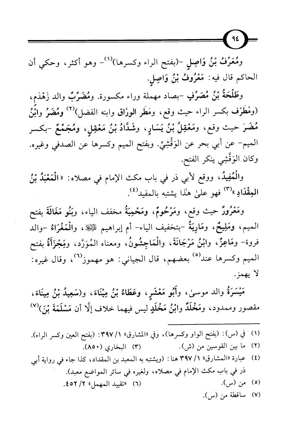 وطَلْحَةُ بْنُ مُصَرِّفٍ - بصاد مهملة وراء مكسورة ومُضَرِّبٌ والد زَهْدَمٍ، (ومُطَرِّف بكسر الراء حيث وقع، ومَطَر الورَّاق وابنه الفضل) (¬2) ومُضَرُ وابْنُ مُضَرَ حيث وقع، ومَعْقِلُ بْنُ يَسَارٍ، وشَدَّادُ بْنُ مَعْقِلٍ، ومُجَمِّعٌ - بكسر الميم - عن أبي بحر عن الوَقَّشِيِّ. وبفتح الميم وكسرها عن الصدفي وغيره.