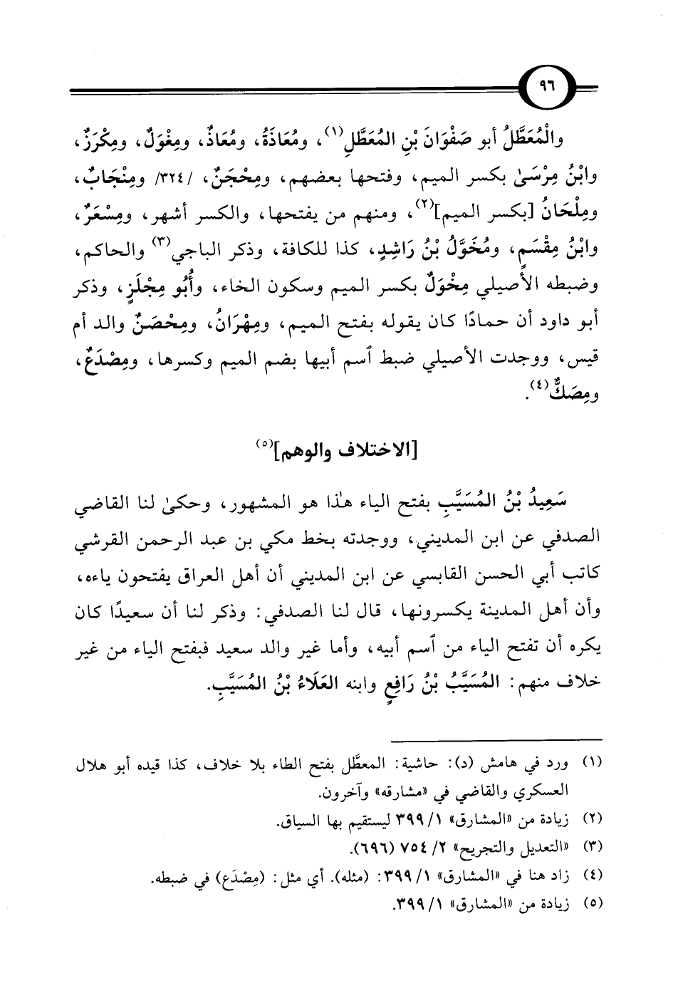 والْمُعَطَّلُ أبو صَفْوَانَ بْنِ المُعَطَّلِ (¬1)، ومُعَاذَةُ، ومُعَاذٌ، ومِغْوَلٌ، ومِكْرَزٌ، وابْنُ مِرْسَى بكسر الميم، وفتحها بعضهم، ومِحْجَنٌ، ومِنْجَابٌ، ومِلْحَانُ [بكسر الميم] (¬2)، ومنهم من يفتحها، والكسر أشهر، ومِسْعَرٌ، وابْنُ مِقْسَمٍ، ومُخَوَّلُ بْنُ رَاشِدٍ، كذا للكافة، وذكر الباجي (¬3) والحاكم، وضبطه الأصيلي مِخْوَلٌ بكسر الميم وسكون الخاء، وأُبُو مِجْلَزٍ، وذكر أبو داود أن حمادًا كان يقوله بفتح الميم، ومِهْرَانُ، ومِحْصَنٌ والد أم قيس، ووجدت الأصيلي ضبط اسم أبيها بضم الميم وكسرها، ومِصْدَعٌ، ومِصَكٌّ (¬4).