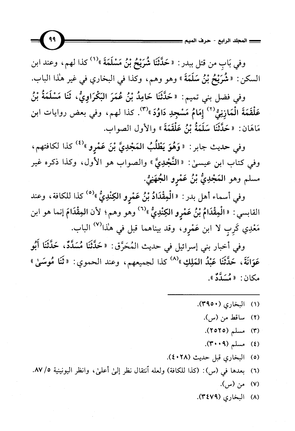 وفي فضل بني تميم: "حَدَّثنَا حَامِدُ بْنُ عُمَرَ البَكْرَاوِيُّ، ثنَا مَسْلَمَةُ بْنُ عَلْقَمَةَ الْمَازِنيُّ (¬2) إِمَامُ مَسْجدِ دَاوُدَ" (¬3). كذا لهم، وفي بعض روايات ابن مَاهَان: "حَدَّثنَا سَلَمَةُ بْنُ عَلْقَمَةَ" والأول الصواب.