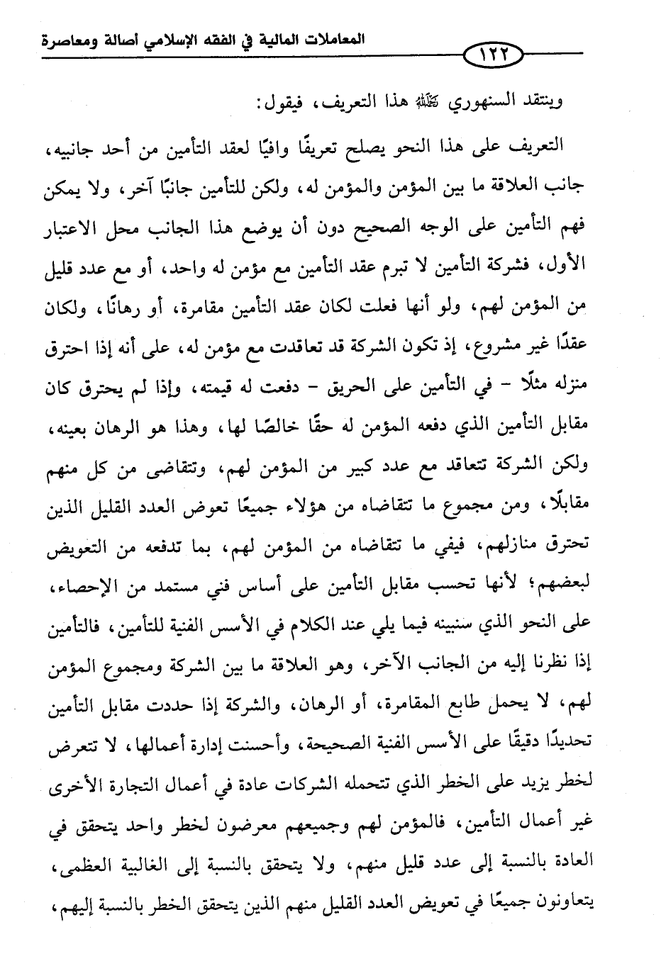 التعريف على هذا النحو يصلح تعريفًا وافيًا لعقد التأمين من أحد جانبيه، جانب العلاقة ما بين المؤمن والمؤمن له، ولكن للتأمين جانبًا آخر، ولا يمكن فهم التأمين على الوجه الصحيح دون أن يوضع هذا الجانب محل الاعتبار الأول، فشركة التأمين لا تبرم عقد التأمين مع مؤمن له واحد، أو مع عدد قليل من المؤمن لهم، ولو أنها فعلت لكان عقد التأمين مقامرة، أو رهانًا، ولكان عقدًا غير مشروع، إذ تكون الشركة قد تعاقدت مع مؤمن له، على أنه إذا احترق منزله مثلًا - في التأمين على الحريق - دفعت له قيمته، وإذا لم يحترق كان مقابل التأمين الذي دفعه المؤمن له حقًا خالصًا لها، وهذا هو الرهان بعينه، ولكن الشركة تتعاقد مع عدد كبير من المؤمن لهم، وتتقاضى من كل منهم مقابلًا، ومن مجموع ما تتقاضاه من هؤلاء جميعًا تعوض العدد القليل الذين تحترق منازلهم، فيفي ما تتقاضاه من المؤمن لهم، بما تدفعه من التعويض لبعضهم؛ لأنها تحسب مقابل التأمين على أساس فني مستمد من الإحصاء، على النحو الذي سنبينه فيما يلي عند الكلام في الأسس الفنية للتأمين، فالتأمين إذا نظرنا إليه من الجانب الآخر، وهو العلاقة ما بين الشركة ومجموع المؤمن لهم، لا يحمل طابع المقامرة، أو الرهبان، والشركة إذا حددت مقابل التأمين تحديدًا دقيقًا على الأسس الفنية الصحيحة، وأحسنت إدارة أعمالها، لا تتعرض لخطر يزيد على الخطر الذي تتحمله الشركات عادة في أعمال التجارة الأخرى غير أعمال التأمين، فالمؤمن لهم وجميعهم معرضون لخطر واحد يتحقق في العادة بالنسبة إلى عدد قليل منهم، ولا يتحقق بالنسبة إلى الغالبية العظمى، يتعاونون جميعًا في تعويض العدد القليل منهم الذين يتحقق الخطر بالنسبة إليهم،