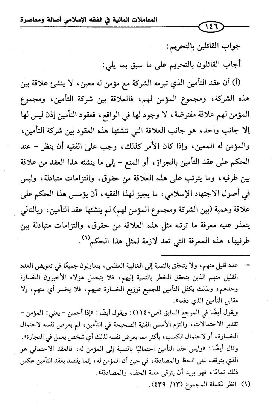 (أ) أن عقد التأمين الذي تبرمه الشركة مع مؤمن له معين، لا ينشئ علاقة بين هذه الشركة، ومجموع المؤمن لهم، فالعلاقة بين شركة التأمين، ومجموع المؤمن لهم علاقة مفترضة، لا وجود لها في الواقع، فعقود التأمين إذن ليس لها إلا جانب واحد، هو جانب العلاقة التي تنشئها هذه العقود بين شركة التأمين، والمؤمن له المعين، وإذا كان الأمر كذلك، وجب على الفقيه أن ينظر -عند الحكم على عقد التأمين بالجواز، أو المنع- إلى ما ينشئه هذا العقد من علاقة بين طرفيه، وما يترتب على هذه العلاقة من حقوق، والتزامات متبادلة، وليس في أصول الاجتهاد الإِسلامي، ما يجيز لهذا الفقيه، أن يؤسس هذا الحكم على علاقة وهمية (بين الشركة ومجموع المؤمن لهم) لم ينشئها عقد التأمين، وبالتالي يتعذر عليه معرفة ما ترتبه مثل هذه العلاقة من حقوق، والتزامات متبادلة بين طرفيها، هذه المعرفة التي تعد لازمة لمثل هذا الحكم (¬١).