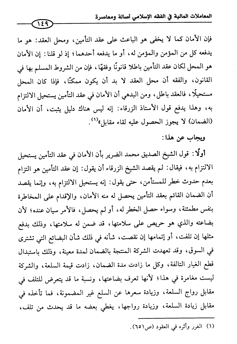أولاً: قول الشيخ الصديق محمد الضرير بأن الأمان في عقد التأمين يستحيل الالتزام به، فيقال: لم يقصد الشيخ الزرقاء أن يقول: إن عقد التأمين هو التزام بعدم حدوث خطر للمستأمن، حتى يقول: إنه يستحيل الالتزام به، وإنما يقصد أن الضمان القائم بعقد التأمين يحصل له منه الأمان، والإقدام على المخاطرة بنفس مطمئنة، وسواء حصل الخطر له، أو لم يحصل، فالأمر سيان عنده؛ لأن بضاعته والذي هو حريص على سلامتها، قد ضمن له سلامتها، وذلك بدفع مثلها إن تلفت، أو إتمامها إن نقصت، شأنه في ذلك شأن البضائع التي تشترى في السوق، وقد تعهدت الشركة المنتجة بالضمان لمدة معينة، وذلك باستبدال قطع الغيار التالفة، وكل ما زادت مدة الضمان، زادت قيمة السلعة، والشركة ليست مغامرة في هذا , لأنها تعرف بضاعتها، ونسبة ما قد يتعرض للتلف في مقابل رواج السلعة، وزيادة سعرها عن السلع غير المضمونة، فما تأخذه في مقابل زيادة السلعة، وزيادة رواجها، يغطي بعضه ما قد يحدث من تلف،