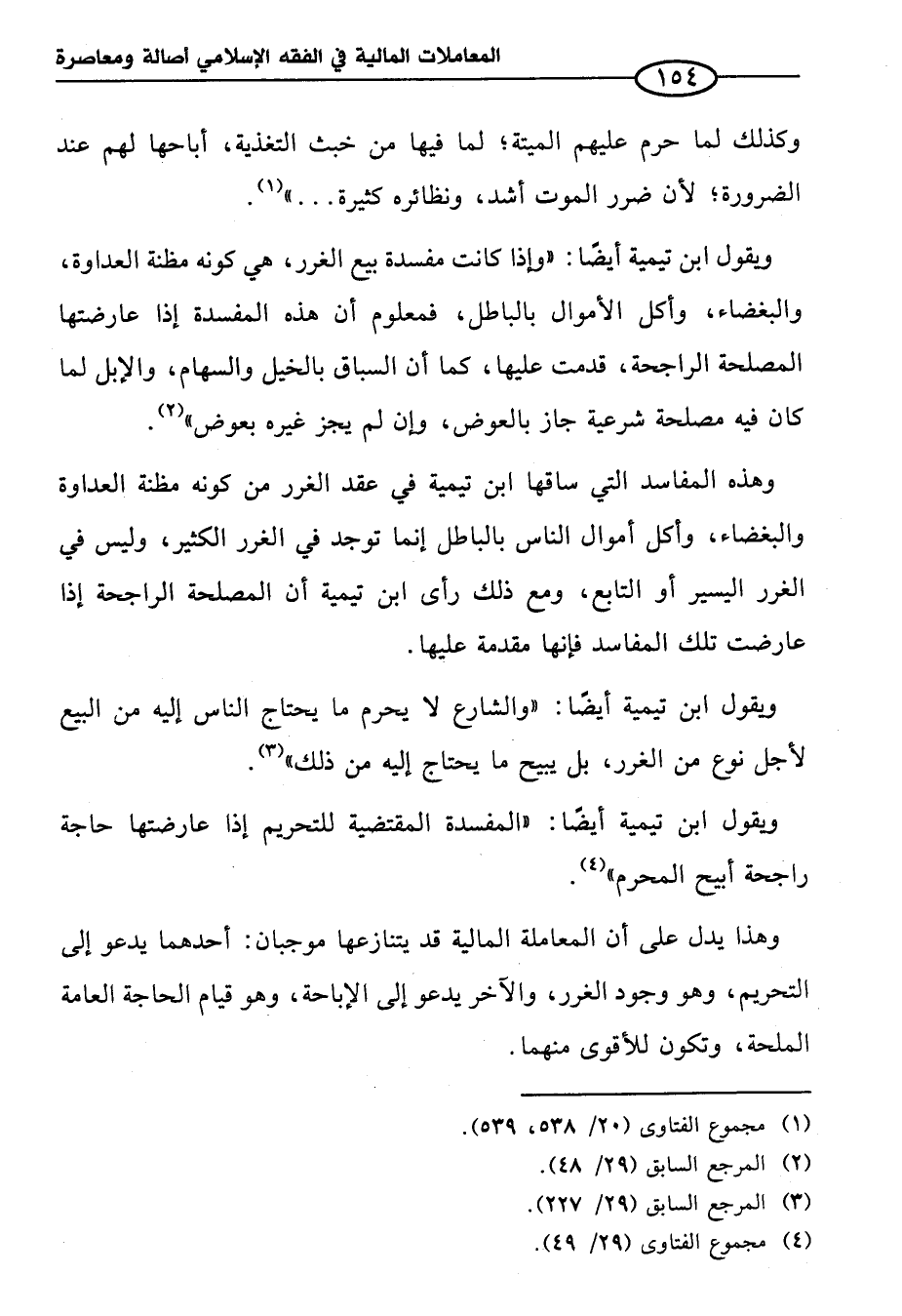 وهذه المفاسد التى ساقها ابن تيمية في عقد الغرر من كونه مظنة العداوة والبغضاء، وأكل أموال الناس بالباطل إنما توجد في الغرر الكثير، وليس في الغرر اليسير أو التابع، ومع ذلك رأى ابن تيمية أن المصلحة الراجحة إذا عارضت تلك المفاسد فإنها مقدمة عليها.