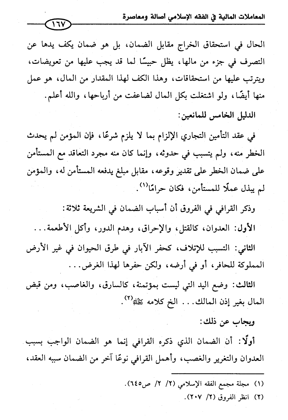 أولاً: أن الضمان الذي ذكره القرافي إنما هو الضمان الواجب بسبب العدوان والتغرير والغصب، وأهمل القرافي نوعًا آخر من الضمان سببه العقد،