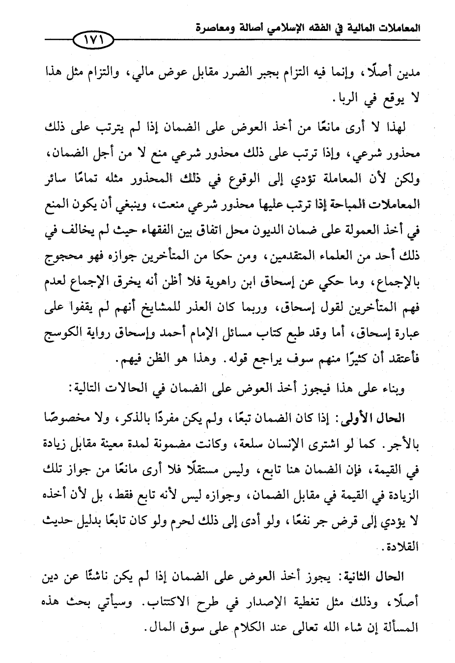 الحال الأولى: إذا كان الضمان تبعًا, ولم يكن مفردًا بالذكر، ولا مخصوصًا بالأجر. كما لو اشترى الإنسان سلعة، وكانت مضمونة لمدة معينة مقابل زيادة في القيمة، فإن الضمان هنا تابع، وليس مستقلًا فلا أرى مانعًا من جواز تلك الزيادة في القيمة في مقابل الضمان، وجوازه ليس لأنه تابع فقط، بل لأن أخذه لا يؤدي إلى قرض جر نفعاً، ولو أدى إلى ذلك لحرم ولو كان تابعًا بدليل حديث القلادة ..