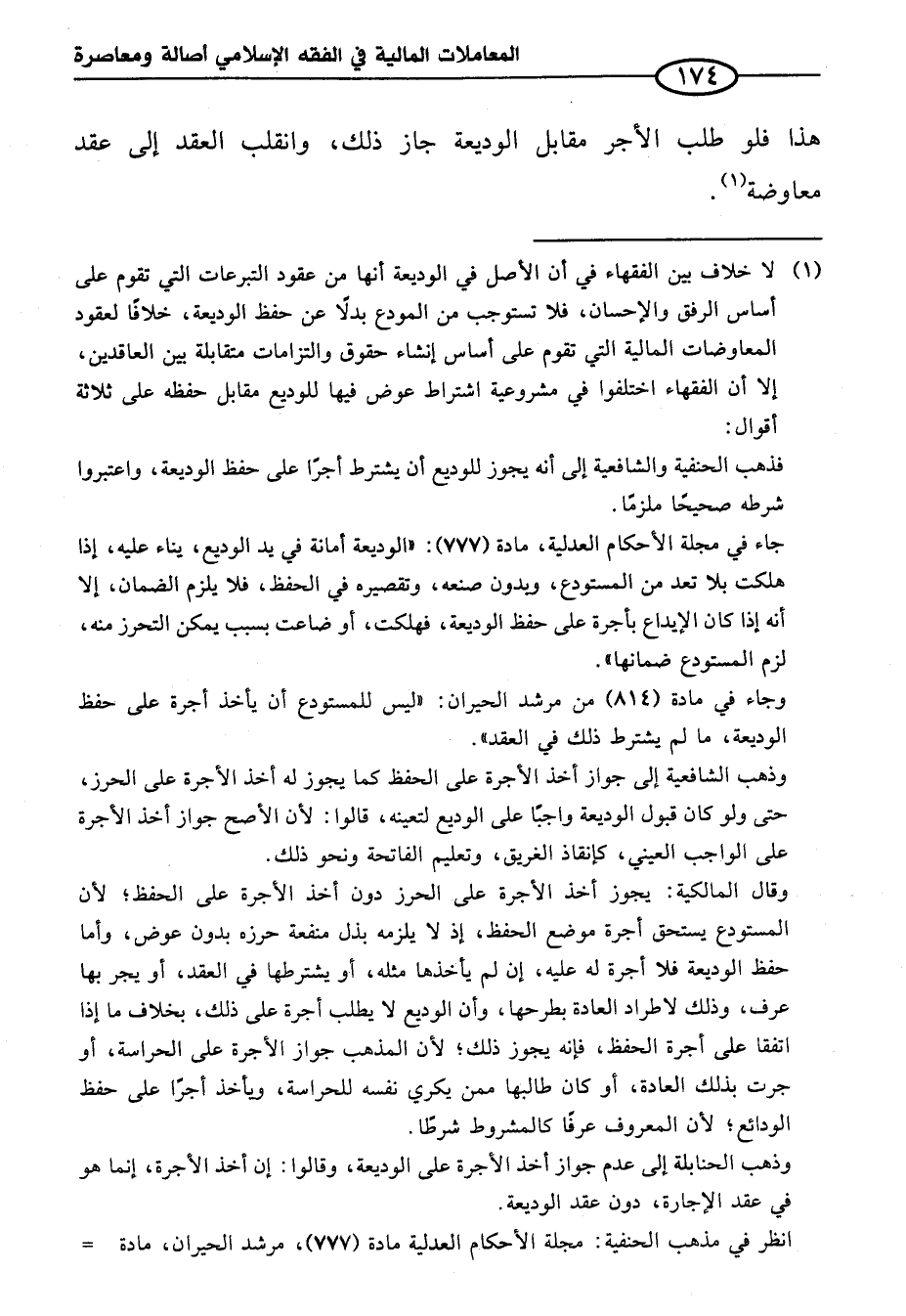 وجاء في مادة (٨١٤) من مرشد الحيران: "ليس للمستودع أن يأخذ أجرة على حفظ الوديعة، ما لم يشترط ذلك في العقد".
