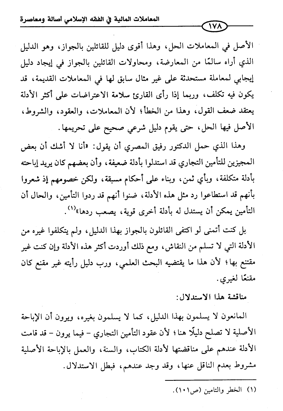 وهذا الذي حمل الدكتور رفيق المصري أن يقول: "أنا لا أشك أن بعض المجيزين للتأمين التجاري قد استدلوا بأدلة ضعيفة، وأن بعضهم كان يريد إباحته بأدلة متكلفة، وبأي ثمن، وبناء على أحكام مسبقة، ولكن خصومهم إذ شعروا بأنهم قد استطاعوا رد مثل هذه الأدلة، ضنوا أنهم قد ردوا التأمين، والحال أن التأمين يمكن أن يستدل له بأدلة أخرى قوية، يصعب ردها" (¬١).