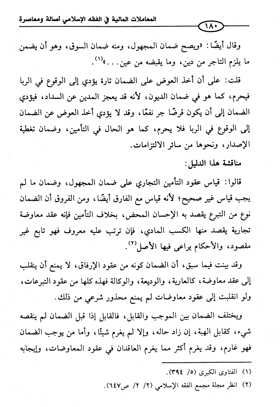 قالوا: قياس عقود التأمين التجاري على ضمان المجهول، وضمان ما لم يجب قياس غير صحيح؛ لأنه قياس مع الفارق أيضًا، ومن الفروق أن الضمان نوع من التبرع يقصد به الإحسان المحض، بخلاف التأمين فإنه عقد معاوضة تجارية يقصد منها الكسب المادي، فإن ترتب عليه معروف فهو تابع غير مقصود، والأحكام يراعى فيها الأصل (¬٢).