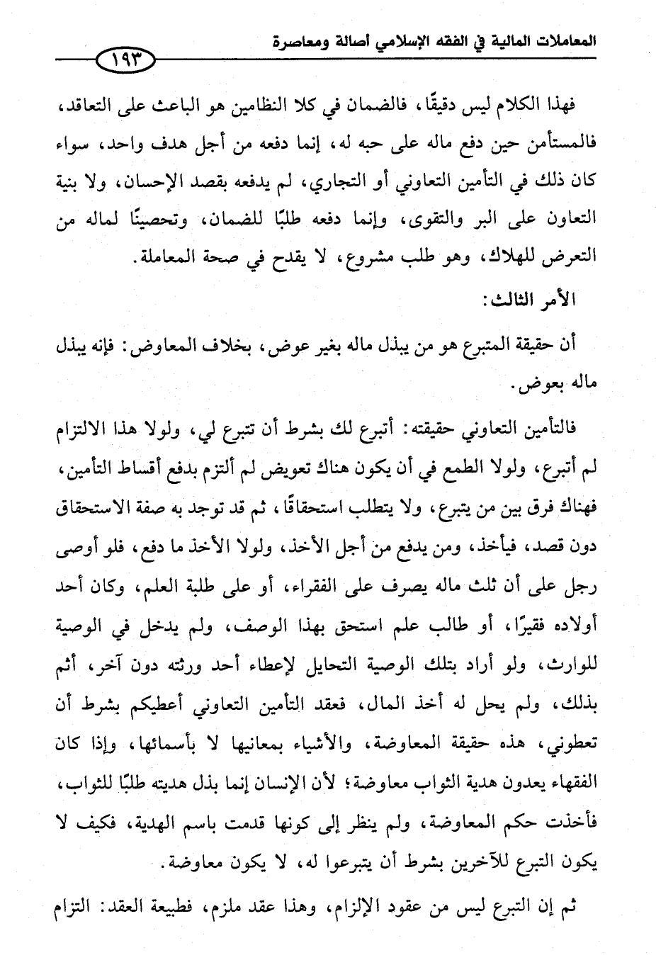 فالتأمين التعاوني حقيقته: أتبرع لك بشرط أن تتبرع لي، ولولا هذا الالتزام لم أتبرع، ولولا الطمع في أن يكون هناك تعويض لم ألتزم بدفع أقساط التأمين، فهناك فرق بين من يتبرع، ولا يتطلب استحقاقًا، ثم قد توجد به صفة الاستحقاق دون قصد، فيأخذ، ومن يدفع من أجل الأخذ، ولولا الأخذ ما دفع، فلو أوصى رجل على أن ثلث ماله يصرف على الفقراء، أو على طلبة العلم، وكان أحد أولاده فقيرًا، أو طالب علم استحق بهذا الوصف، ولم يدخل في الوصية للوارث , ولو أراد بتلك الوصية التحايل لإعطاء أحد ورثته دود آخر، أثم بذلك، ولم يحل له أخذ المال، فعقد التأمين التعاوني أعطيكم بشرط أن تعطوني، هذه حقيقة المعاوضة، والأشياء بمعانيها لا بأسمائها، وإذا كان الفقهاء يعدون هدية الثواب معاوضة؛ لأن الإنسان إنما بذل هديته طلبًا للثواب، فأخذت حكم المعاوضة، ولم ينظر إلى كونها قدمت باسم الهدية، فكيف لا يكون التبرع للآخرين بشرط أن يتبرعوا له، لا يكون معاوضة.