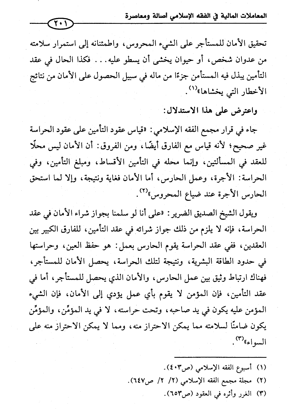 ويقول الشيخ الصديق الضرير: "على أنا لو سلمنا بجواز شراء الأمان في عقد الحراسة، فإنه لا يلزم من ذلك جواز شرائه في عقد التأمين، للفارق الكبير بين العقدين، ففي عقد الحراسة يقوم الحارس بعمل: هو حفظ العين، وحراستها في حدود الطاقة البشرية، ونتيجة لتلك الحراسة، يحصل الأمان للمستأجر، فهناك ارتباط وثيق بين عمل الحارس، والأمان الذي يحصل للمستأجر، أما في عقد التأمين، فإن المؤمن لا يقوم بأي عمل يؤدي إلى الأمان، فإن الشيء المؤمن عليه يكون في يد صاحبه، وتحت حراسته، لا في يد المؤمِّن، والمؤمِّن يكون ضامنًا لسلامته مما يمكن الاحتراز منه، ومما لا يمكن الاحتراز منه على السواء" (¬٣).