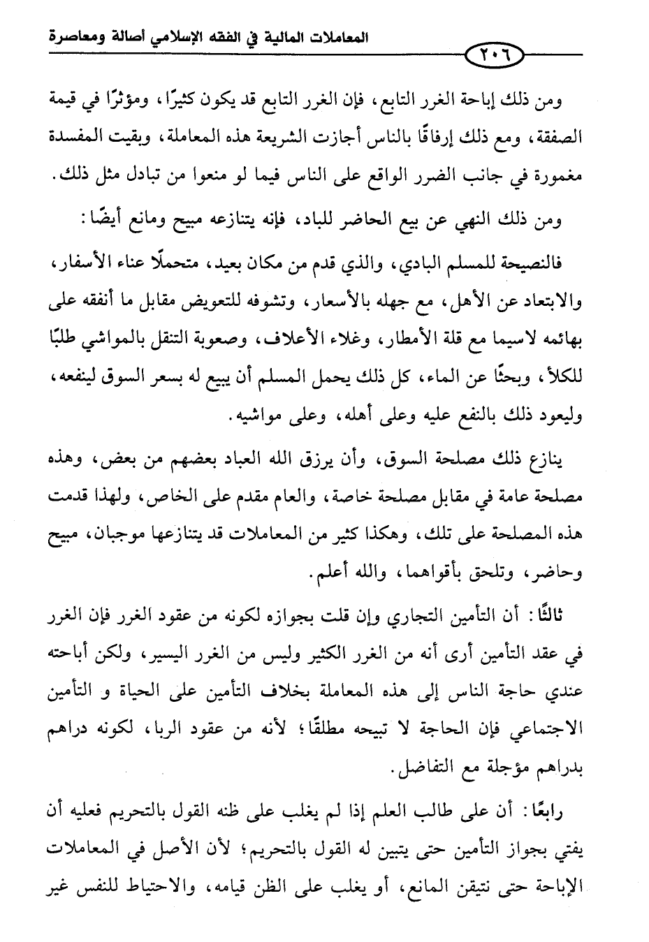 ثالثًا: أن التأمن التجاري وإن قلت بجوازه لكونه من عقود الغرر فإن الغرر في عقد التأمين أرى أنه من الغرر الكثير وليس من الغرر اليسير، ولكن أباحته عندي حاجة الناس إلى هذه المعاملة بخلاف التأمين على الحياة والتأمين الاجتماعي فإن الحاجة لا تبيحه مطلقًا؛ لأنه من عقود الربا، لكونه دراهم بدراهم مؤجلة مع التفاضل.
