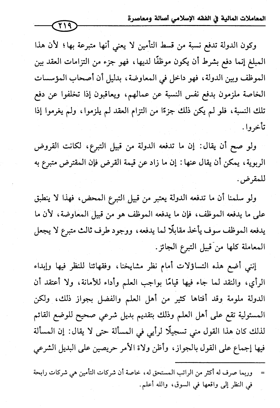 وكون الدولة تدفع نسبة من قسط التأمين لا يعني أنها متبرعة بها؛ لأن هذا المبلغ إنما دفع بشرط أن يكون موظفًا لديها، فهو جزء من التزامات العقد بين الموظف وبين الدولة، فهو داخل في المعاوضة، بدليل أن أصحاب المؤسسات الخاصة ملزمون بدفع نفس النسبة عن عمالهم، ويعاقبون إذا تخلفوا عن دفع تلك النسبة، فلو لم يكن ذلك جزءًا من التزام العقد لم يلزموا, ولم يغرموا إذا تأخروا.
