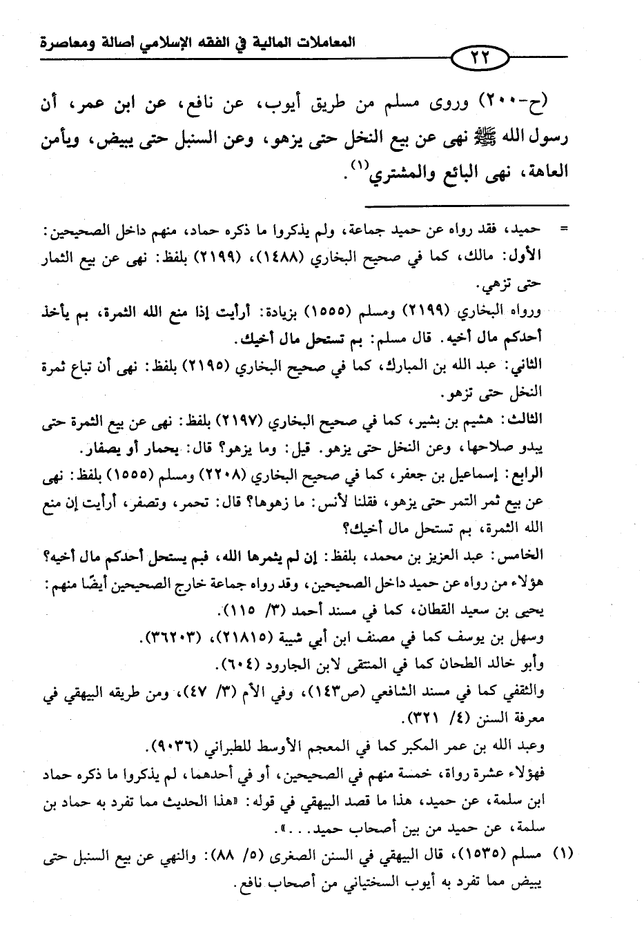 (ح - ٢٠٠) وروى مسلم من طريق أيوب، عن نافع، عن ابن عمر، أن رسول الله - صلى الله عليه وسلم - نهى عن بيع النخل حتى يزهو، وعن السنبل حتى يبيض، ويأمن العاهة، نهى البائع والمشتري (¬١).