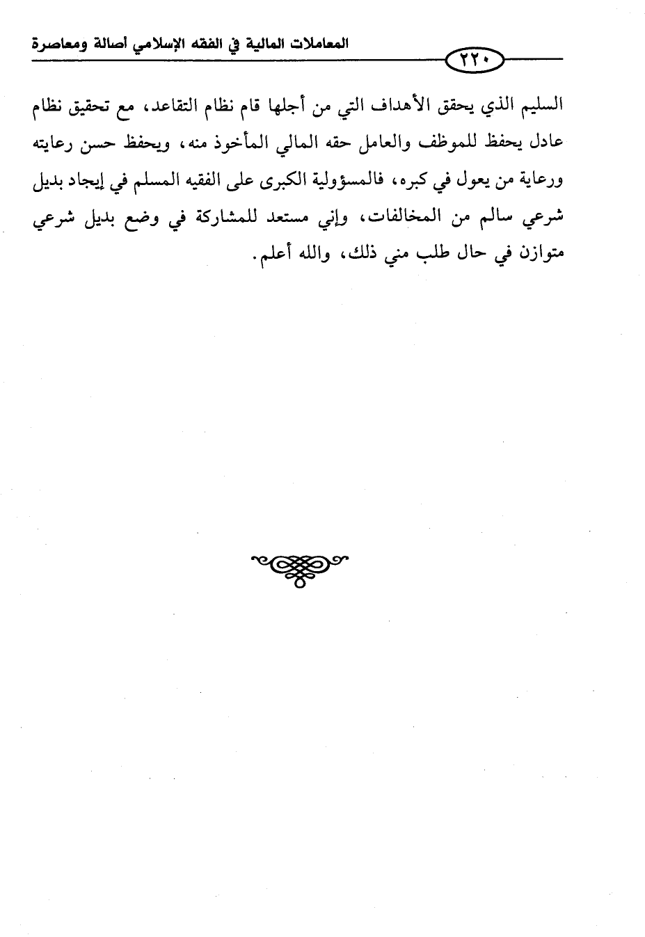 السليم الذي يحقق الأهداف التي من أجلها قام نظام التقاعد، مع تحقيق نظام عادل يحفظ للموظف والعامل حقه المالي المأخوذ منه، ويحفظ حسن رعايته ورعاية من يعول في كبره، فالمسؤولية الكبرى على الفقيه المسلم في إيجاد بديل شرعي سالم من المخالفات، وإني مستعد للمشاركة في وضع بديل شرعي متوازن في حال طلب مني ذلك، والله أعلم.